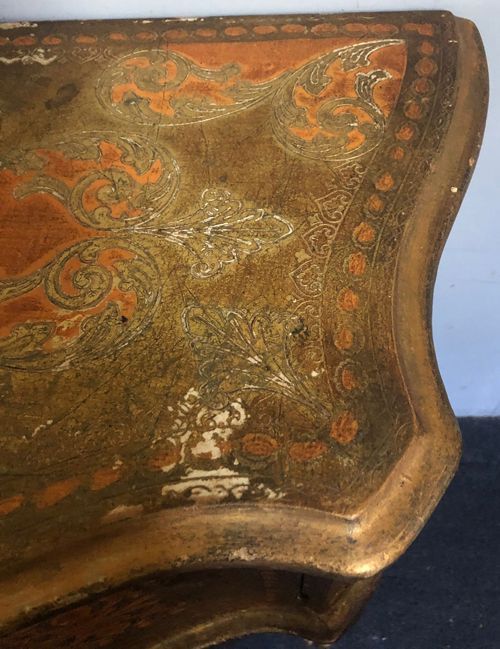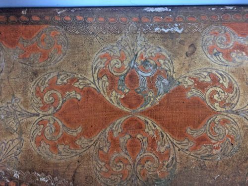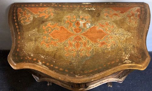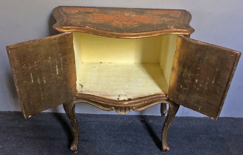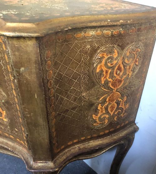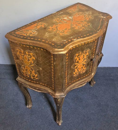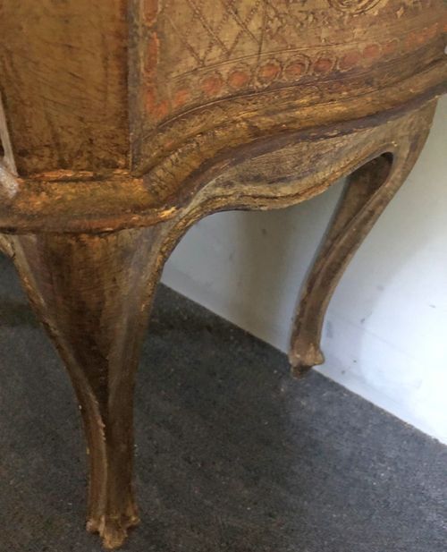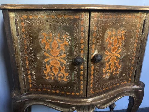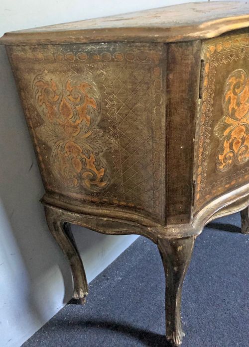 Ref 8191 - Vintage Italian cupboard finished in original worn embossed gilt and terracotta painted decoration. Circa 1950.