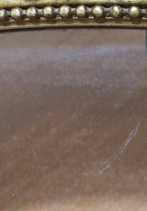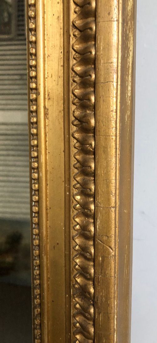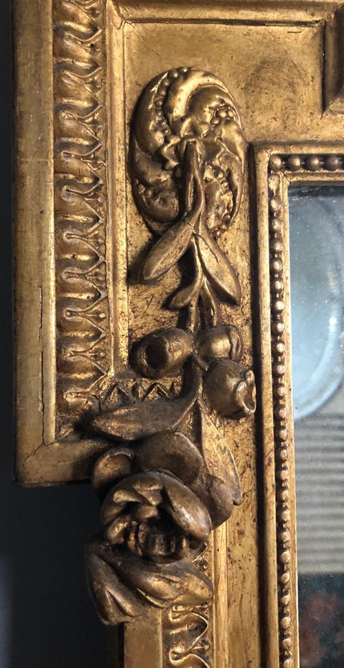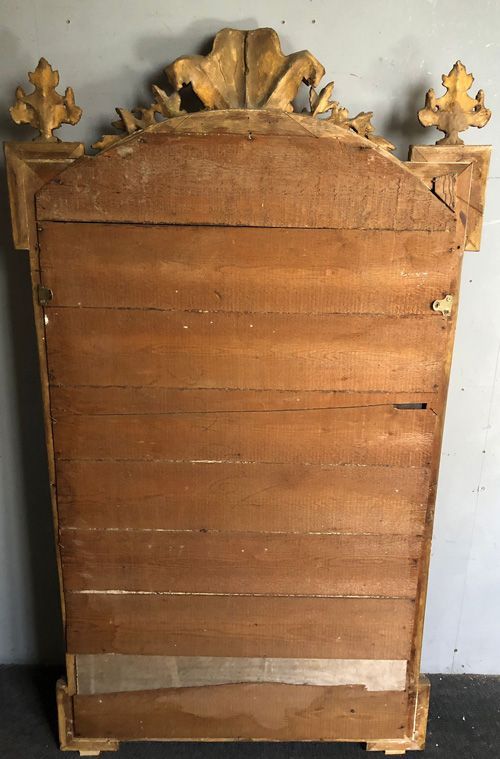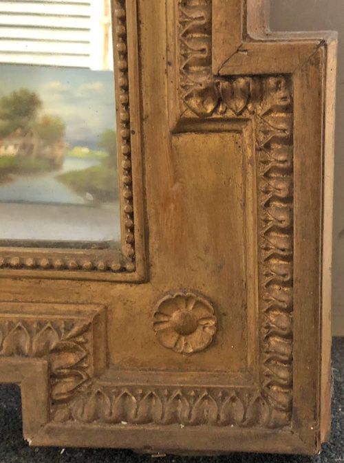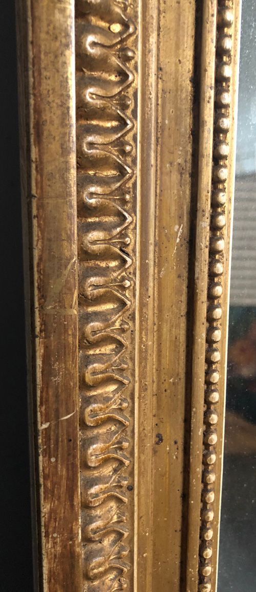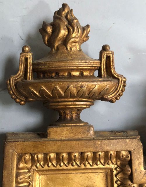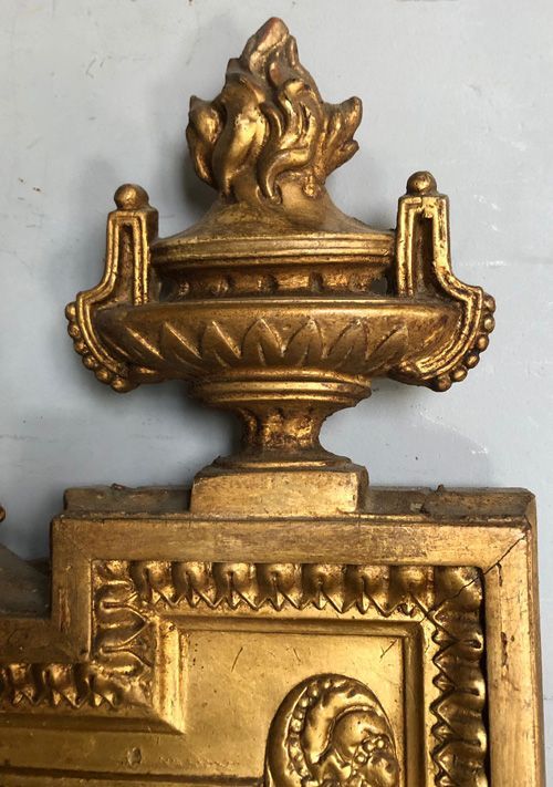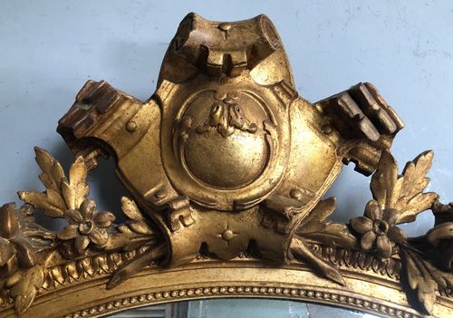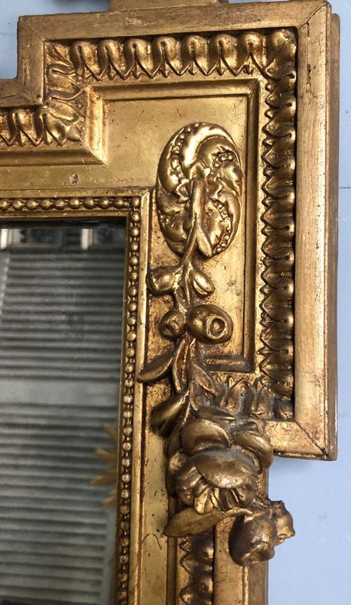 Ref 8215- Antique French Mirror - Gilt on red Louis XVI crested mirror with gesso decoration to frame. Original glass with faint mottled patination to back of plate and a small surface scratch to top centre of plate. Original pine board back with one replacement board. Circa 1880.