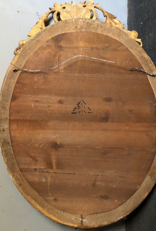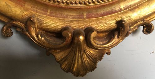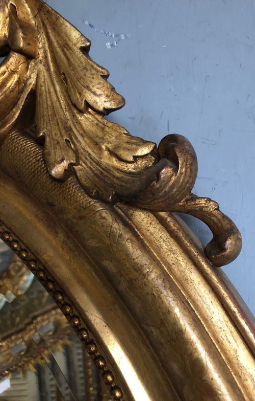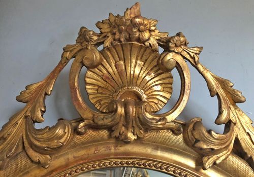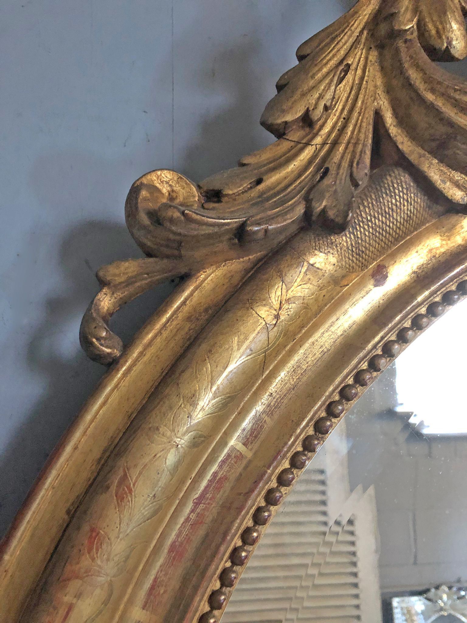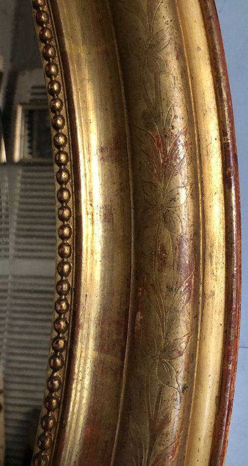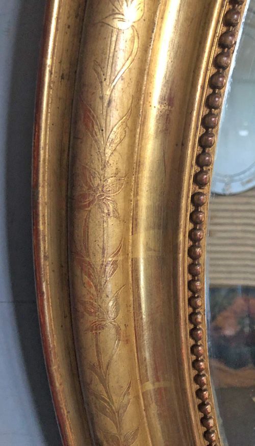 Ref 8216 - Antique French Mirror - Large gilt on red double crested Louis Philippe antique oval mirror with flower and leaf etching to frame. Original two tone gilt worn through to red bole in places. Original bevelled glass. Original pine board back. Circa 1880.
