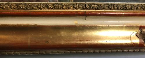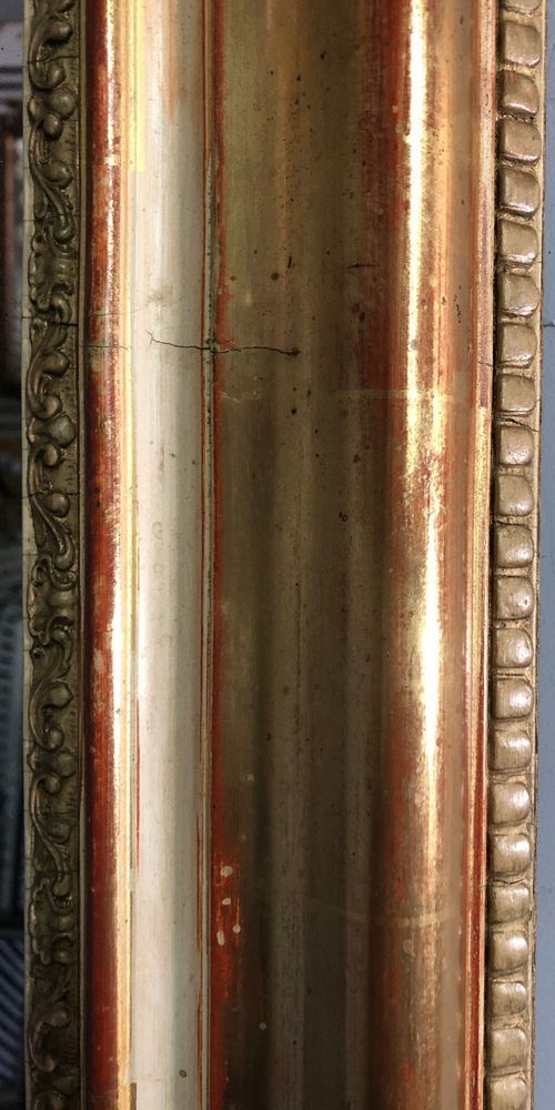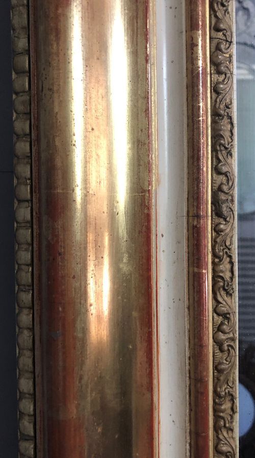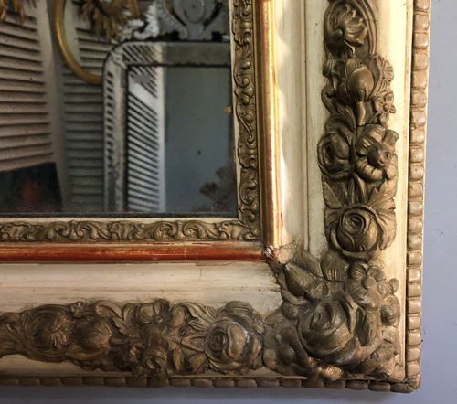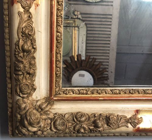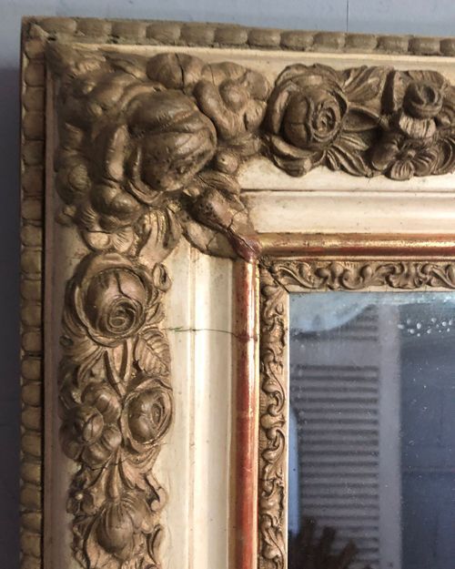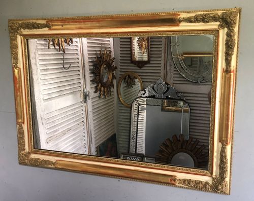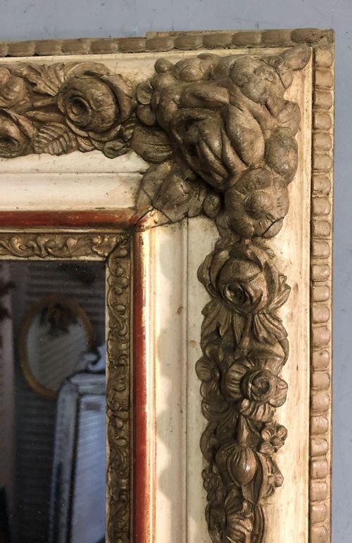 Ref 8217 - Antique French Mirror - Period Restauration antique French mirror with gilt bands worn through to red bole in places. Cream gesso with putty coloured gesso decoration to frame. Landscape/Portrait. New glass. Old pine board back. Circa 1820.