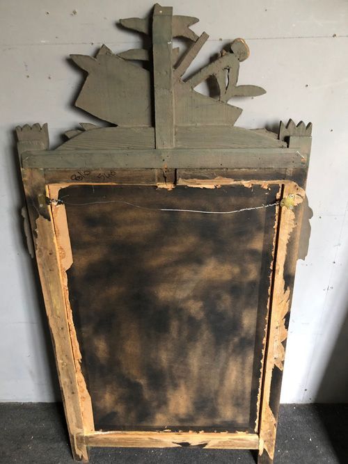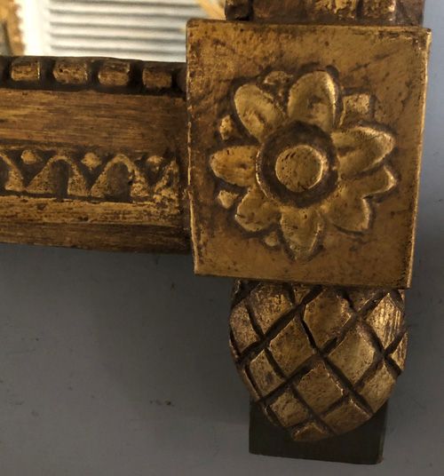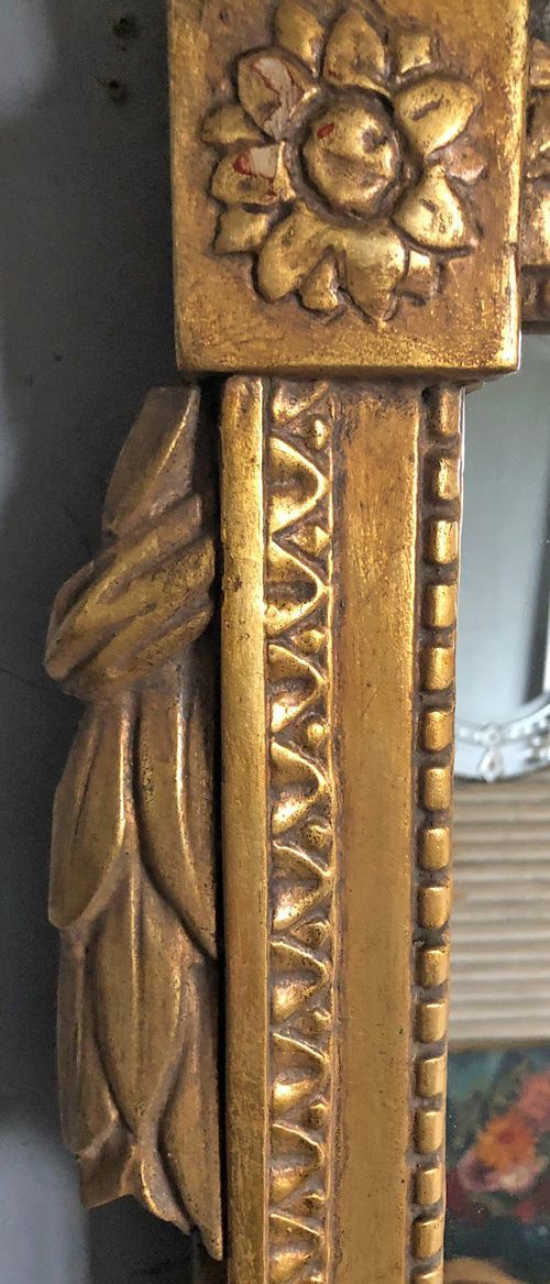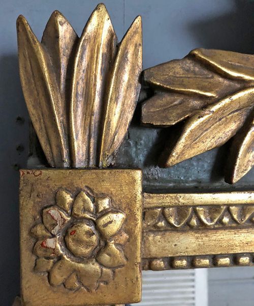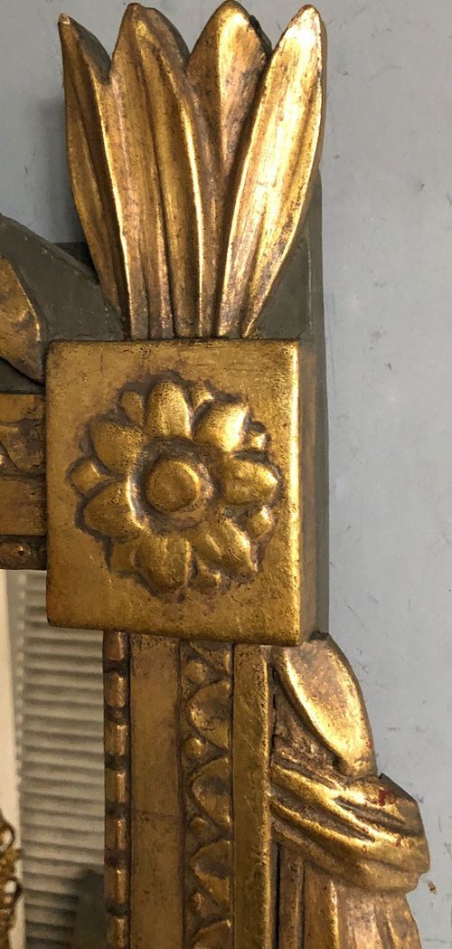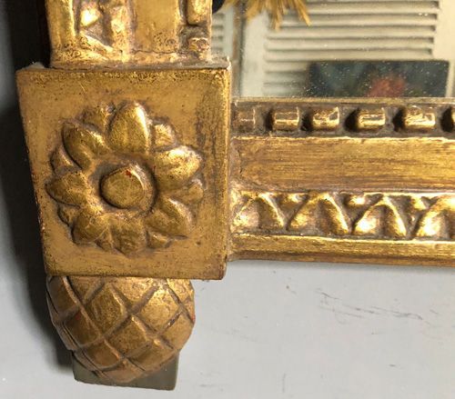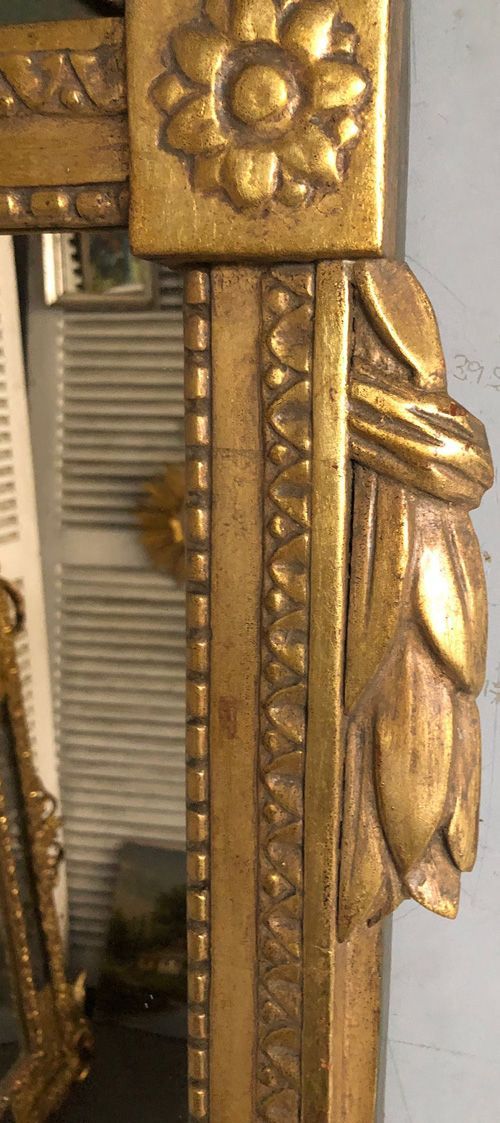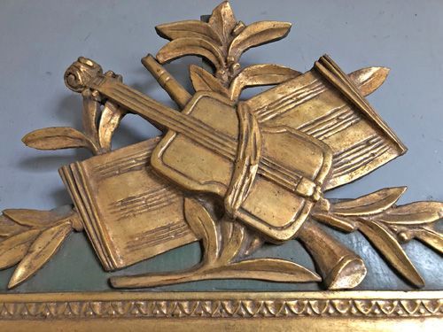 Ref 8218 - Antique French Mirror - Carved giltwood Louis XVI crested antique mirror with musical themed decoration to crest. Finished in two tone gilt on red with old dark green paint to crest relief and shoulders. New glass. Later thin card back. Circa 1850.