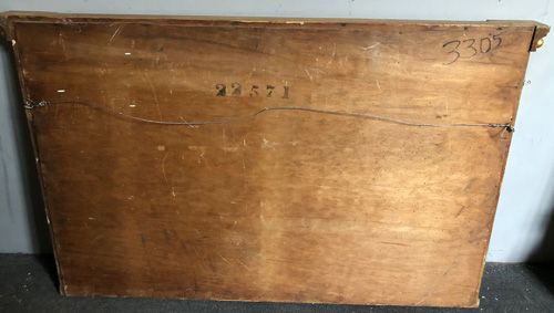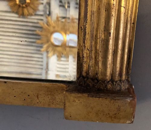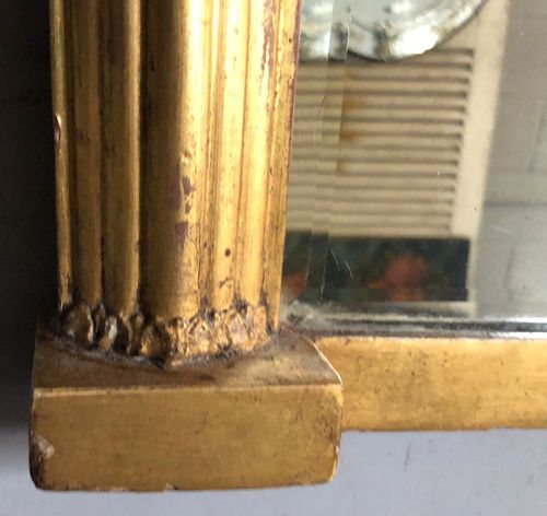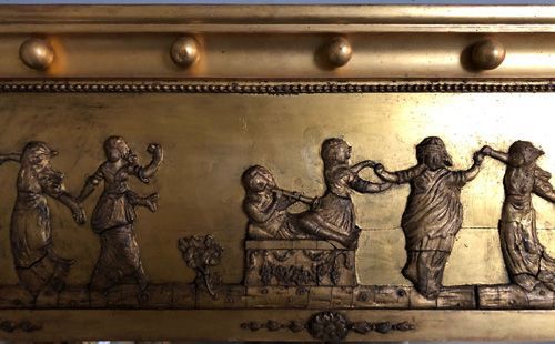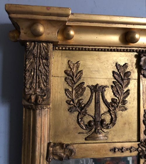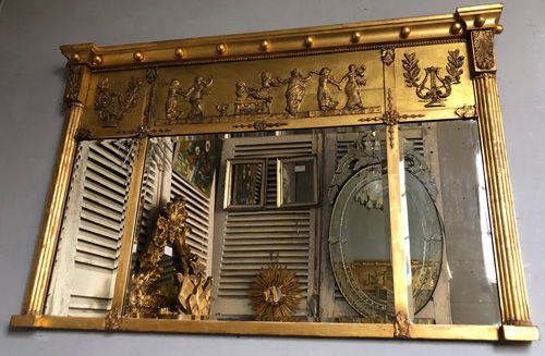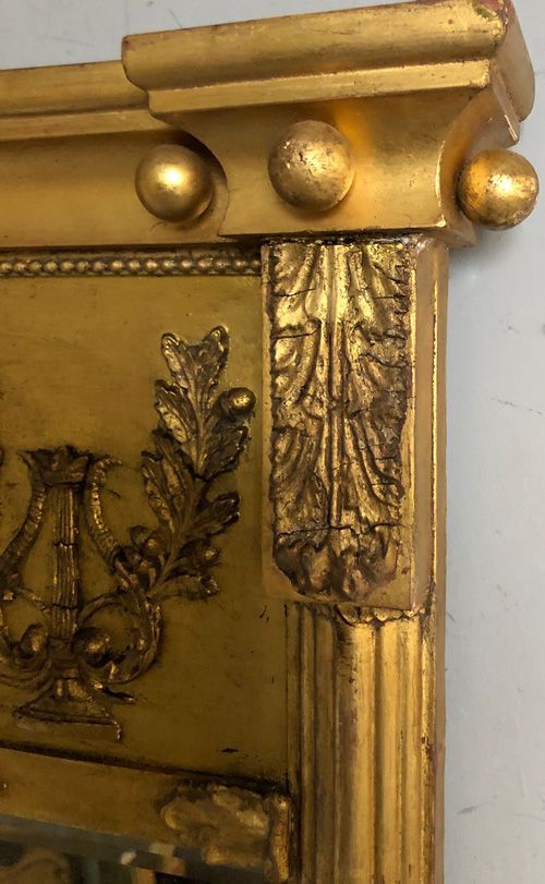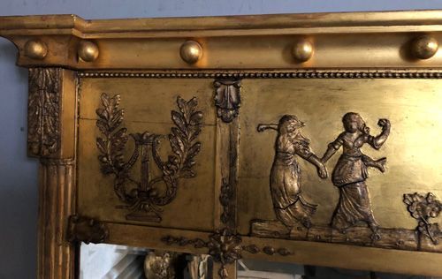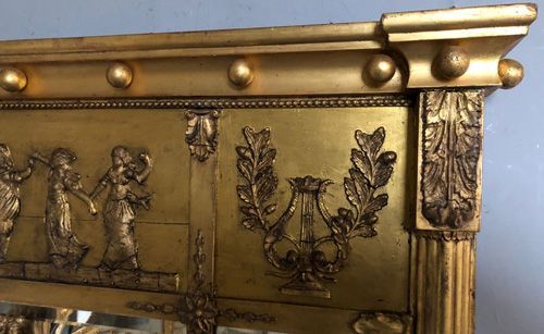 Ref 8227 - Regency style English tripleplate antique mirror with classical frieze. Finished in original two tone gilt on red. Original bevelled glass. Original thin plywood back. Circa 1930.