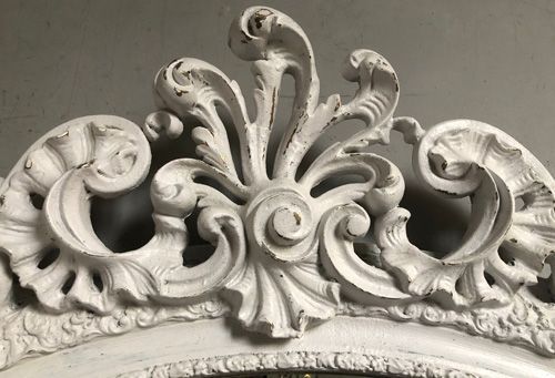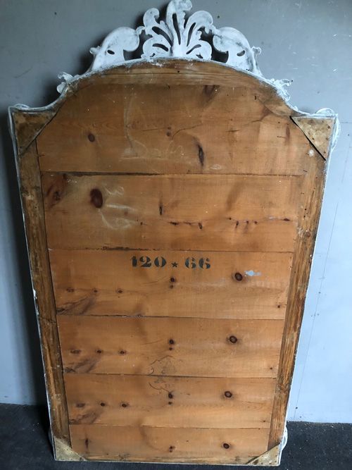 Ref 8243 - Antique French Mirror - Worn pale grey painted gesso crested antique mirror. Original glass. Original pine board back. Circa 1880.