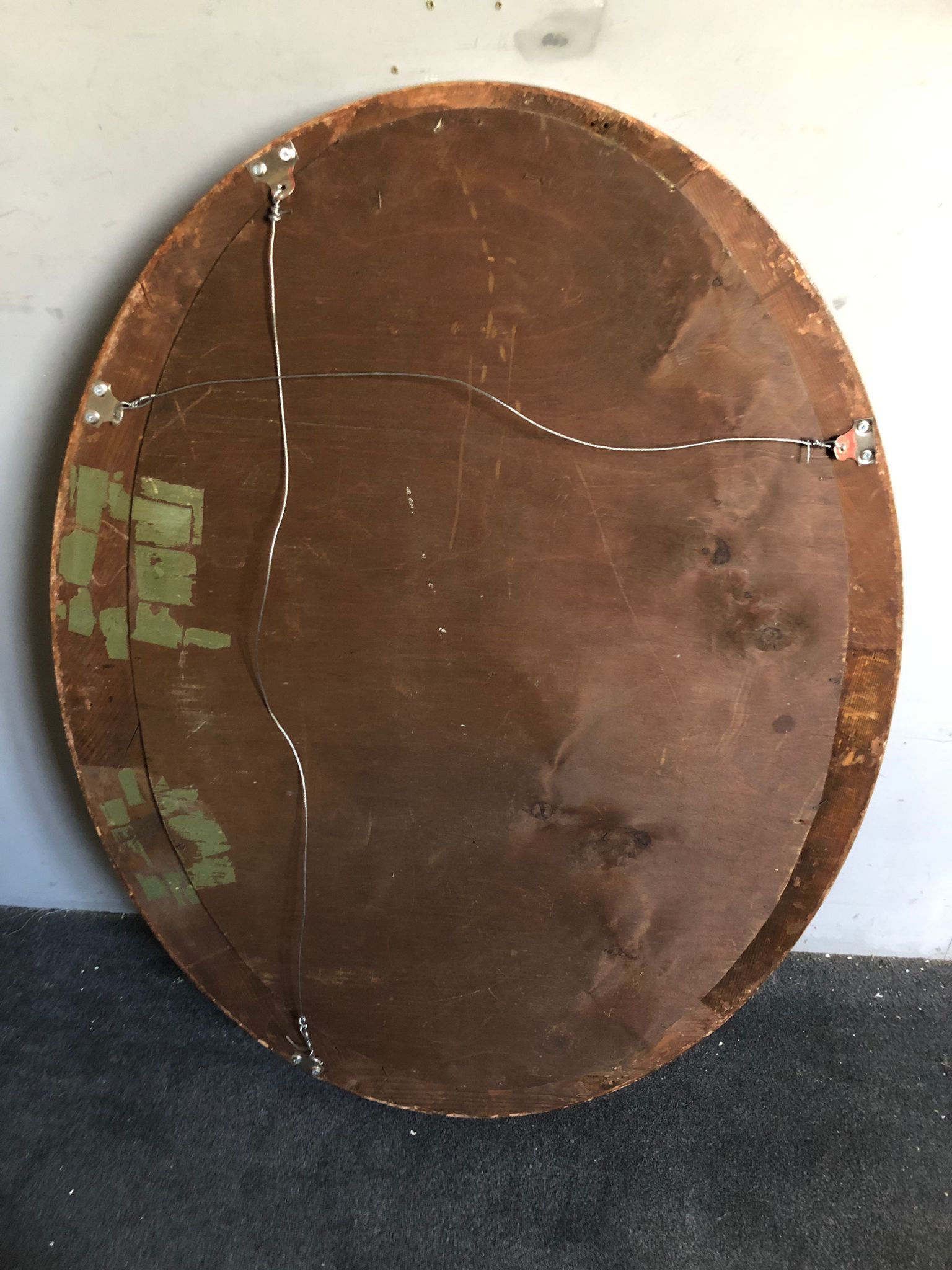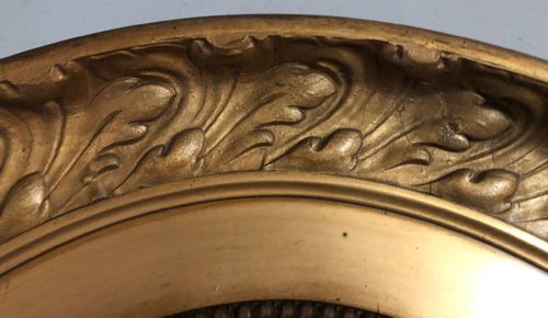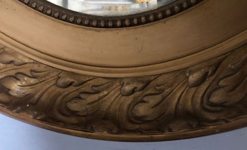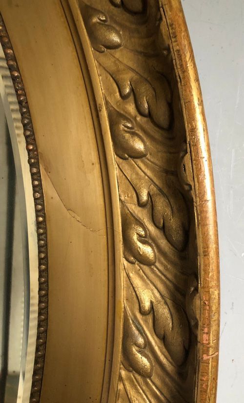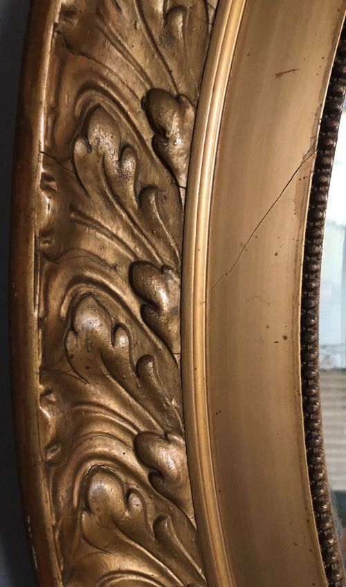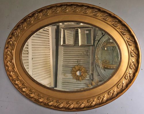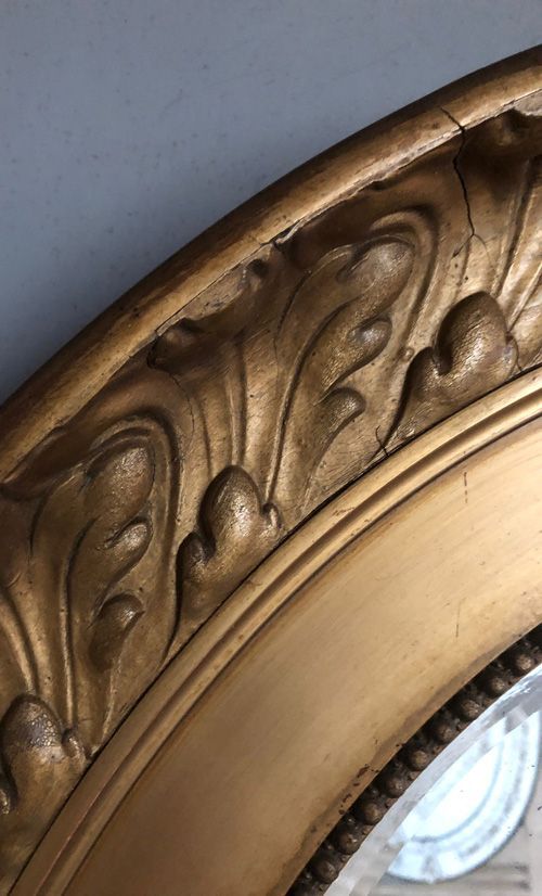 Ref 8246 - Antique French Mirror - Gilt antique oval mirror with gesso decoration. Landscape/portrait. Some non-structural shrinkage cracks to frame. Original bevelled glass. Original thin veneer back. Circa 1900.