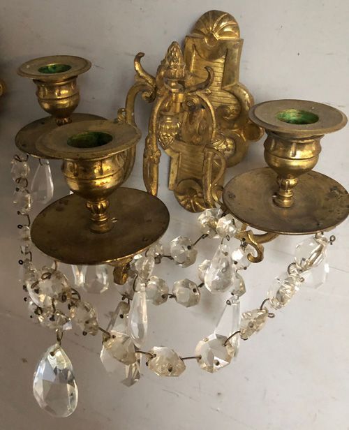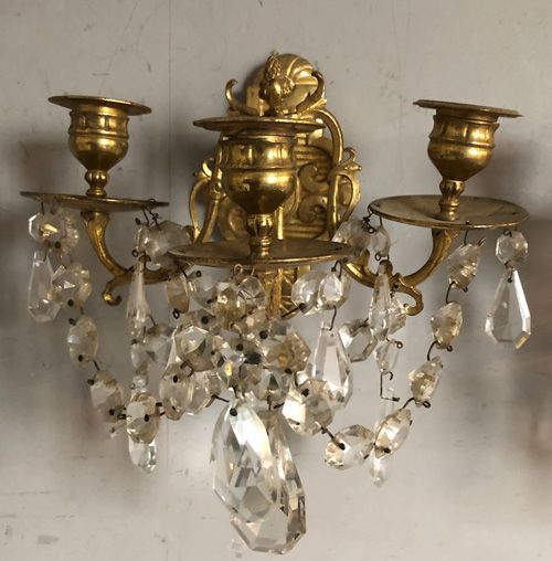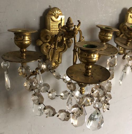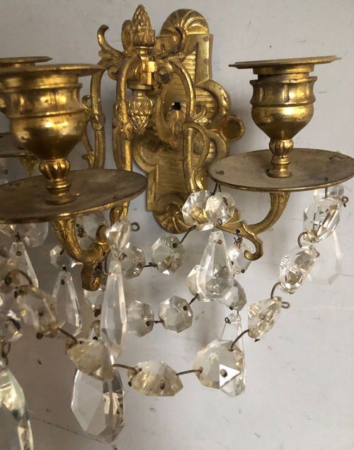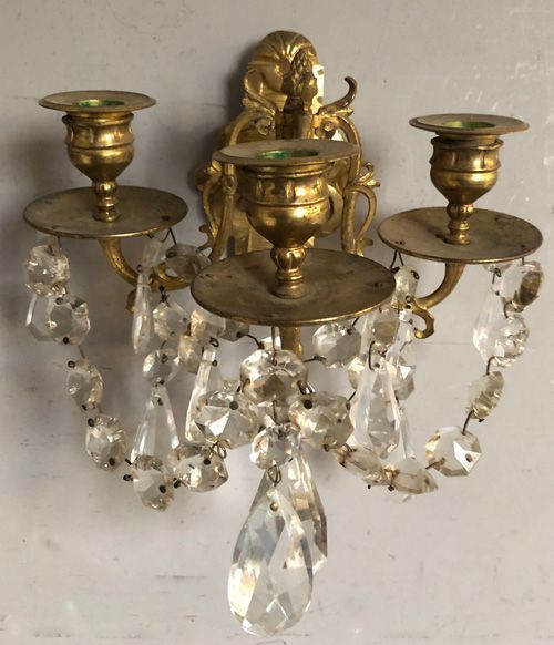 Ref 8257 - Pair of Napoleon III brass three arm wall lights with original clear crystals. For candles or can be wired. Circa 1860.