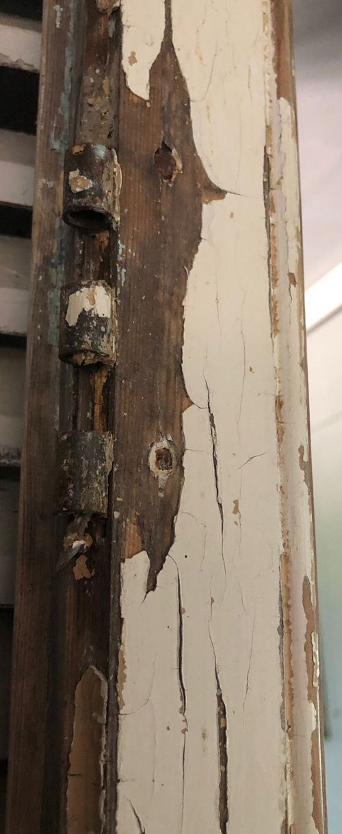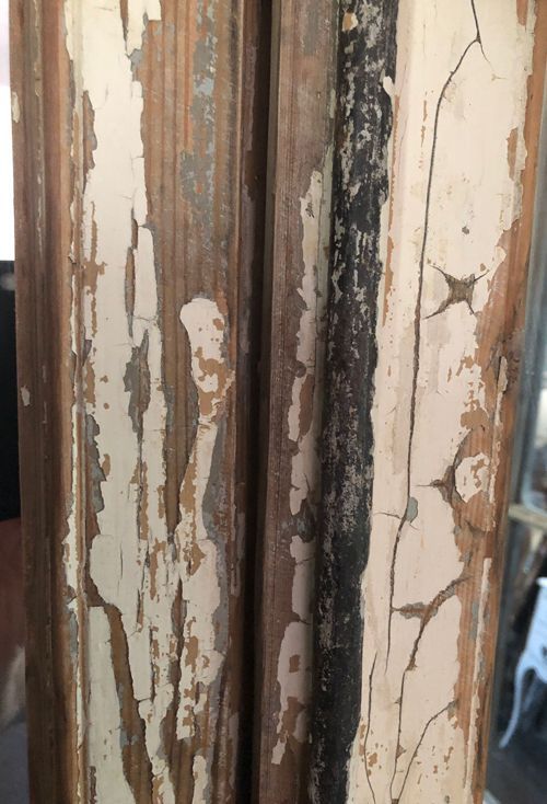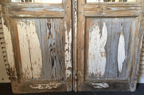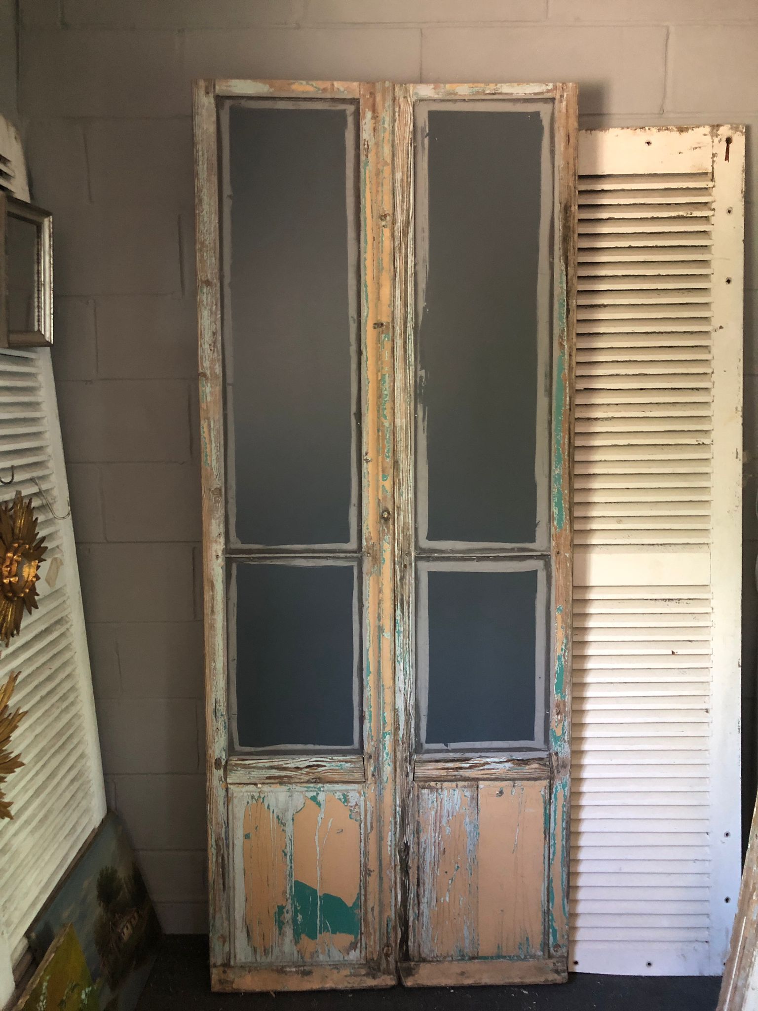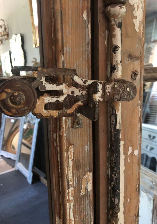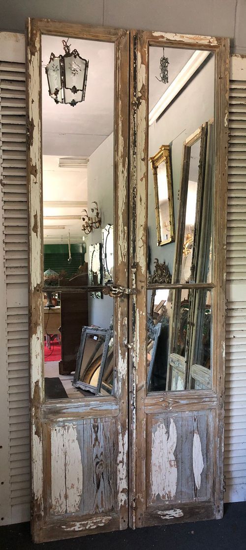 Ref 8270 - Pair of large 19th Century antique French oak doors finished in original worn and flaking paint. Glazed with new mirror glass. Original metal fittings. Circa 1850.