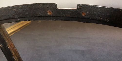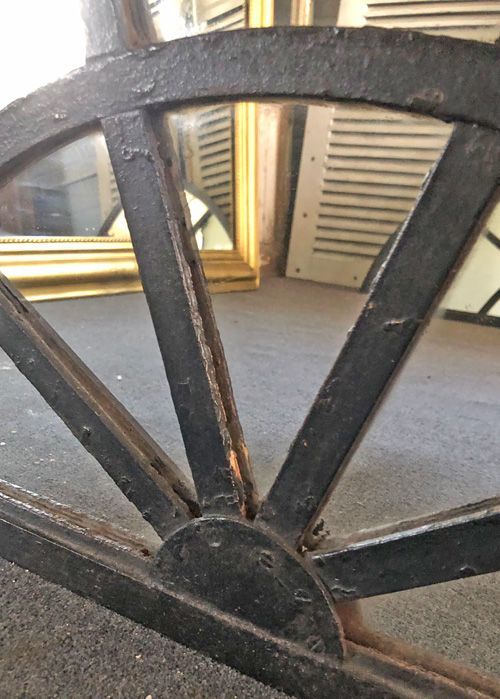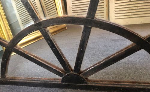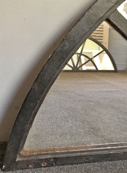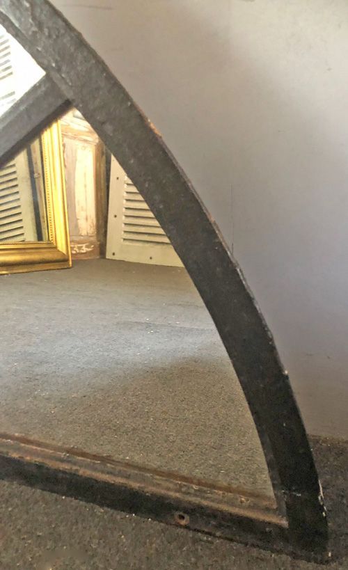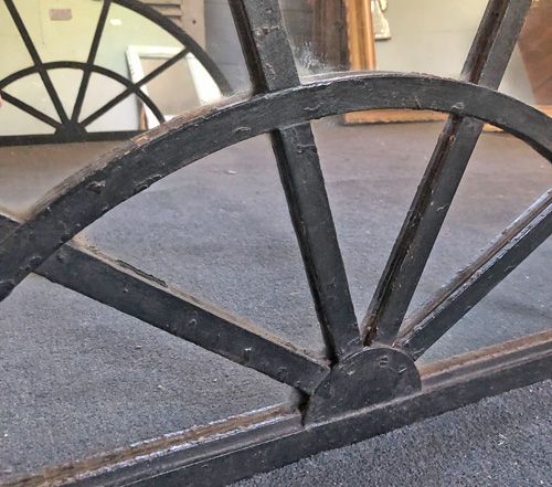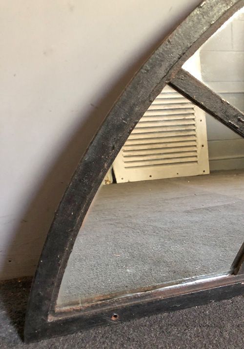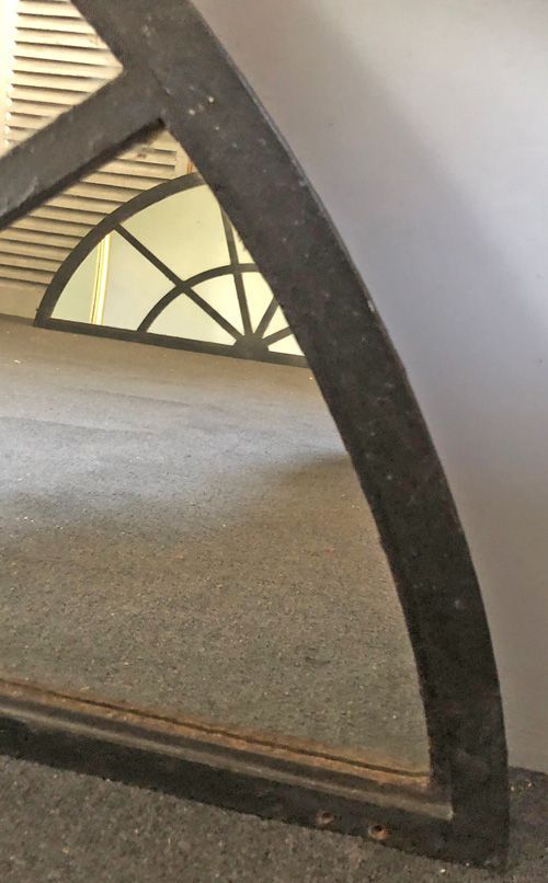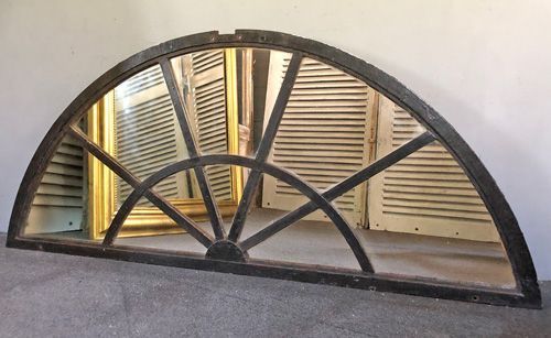 Ref 8277 & 8278 - 19th Century cast iron demi lune window fitted with new mirror glass. Finished in old worn black paint. Painted plywood back. Circa 1880.