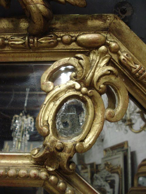 Ref 5930 - Antique French Mirror - Large very decorative gilt on red octagonal cushion crested antique margin mirror finished in original worn two tone gilt. Original mercury glass with evenly patinated centre plate. Original pine board back. Circa 1840.