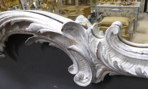 Ref 6684 - Antique French Mirror - Worn white painted Rococo crested antique mirror. Original lightly patinated bevelled glass. Original pine board back. Circa 1890.