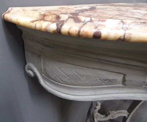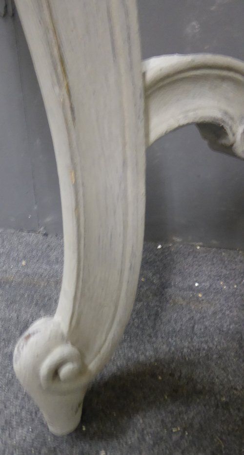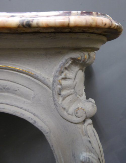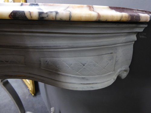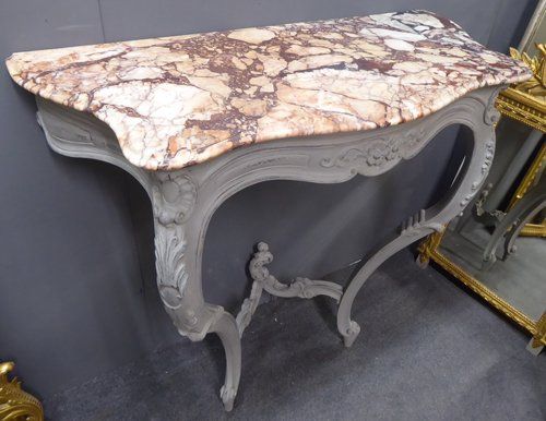 Ref 6773 - Large worn grey painted carved wood Louis XV style antique French console table with original shaped marble top. Circa 1860.