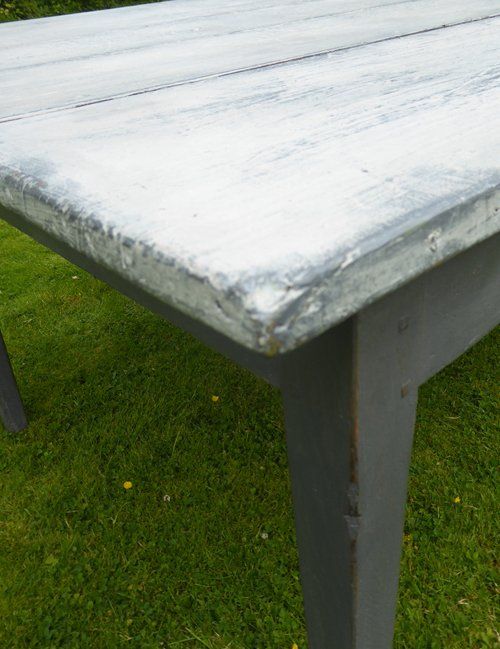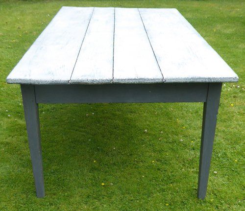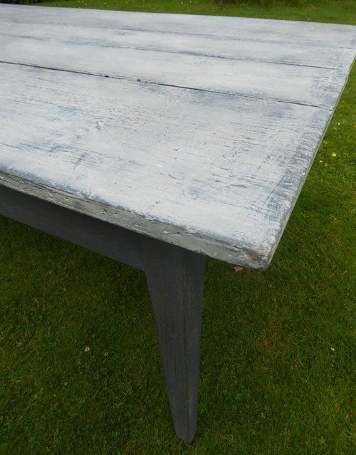 Ref 6788 - Large 19th century rustic French farmhouse table. Worn grey over dark grey painted plank top on a dark grey base. Old inactive treated woodworm holes. Circa 1860.