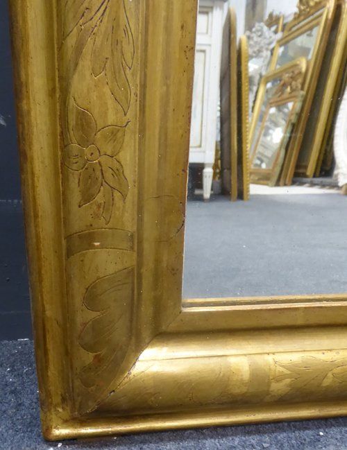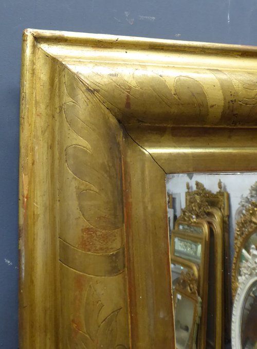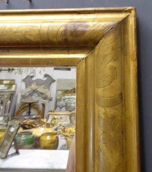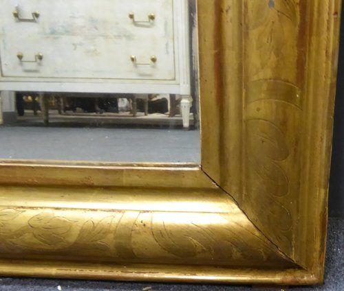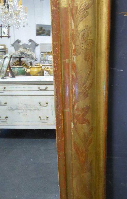 Ref 6801 - Antique French Mirror - Large gilt on red Louis Philippe antique mirror with flower and leaf etching to frame. Landscape/portrait. Original glass with some faint patinated areas and small marks. Original pine board back. Circa 1870.