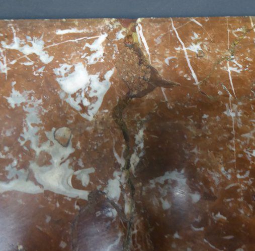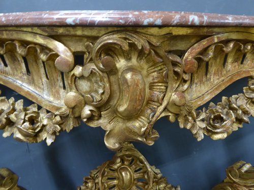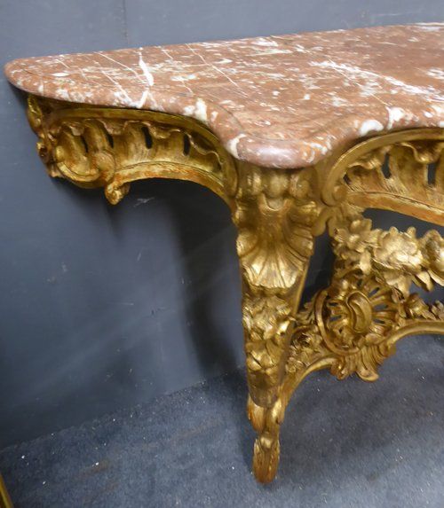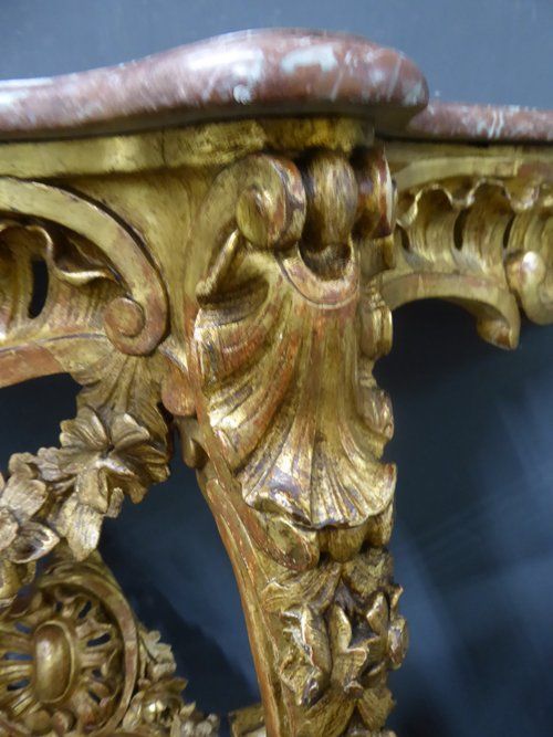 Ref 6830 - Large good quality, carved giltwood Louis XV style antique French console table finished in original worn two tone gilt on red. Original shaped marble top old repair (see close ups). Circa 1880.