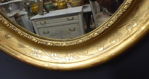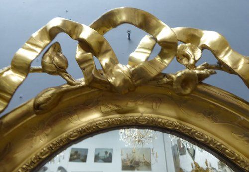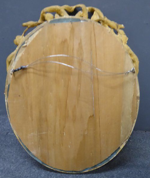 Ref 6900 - Antique French Mirror - Gilt on red ribbon crested Louis Philippe oval antique mirror with flower and leaf etching to frame. Original glass with a few small marks. Thin veneer back. Circa 1880.