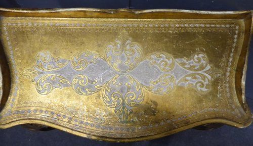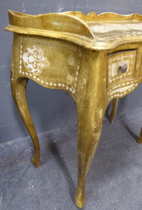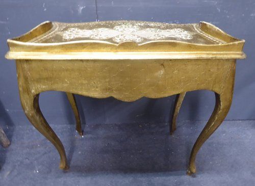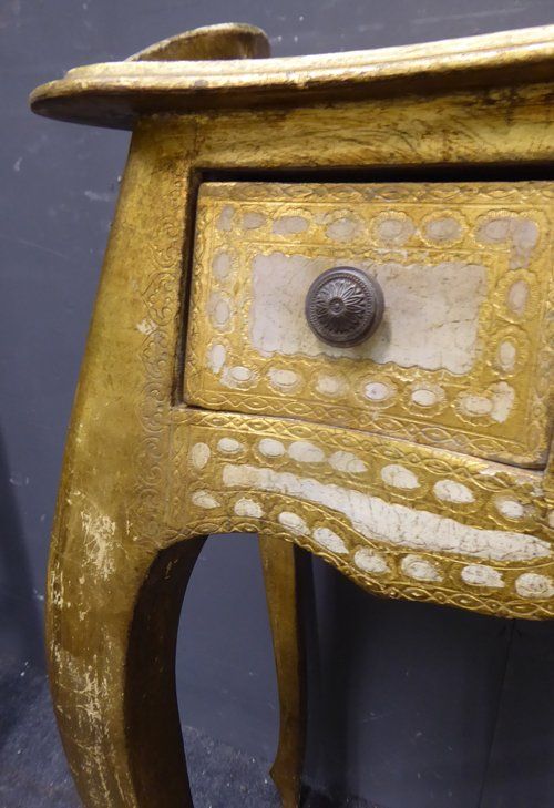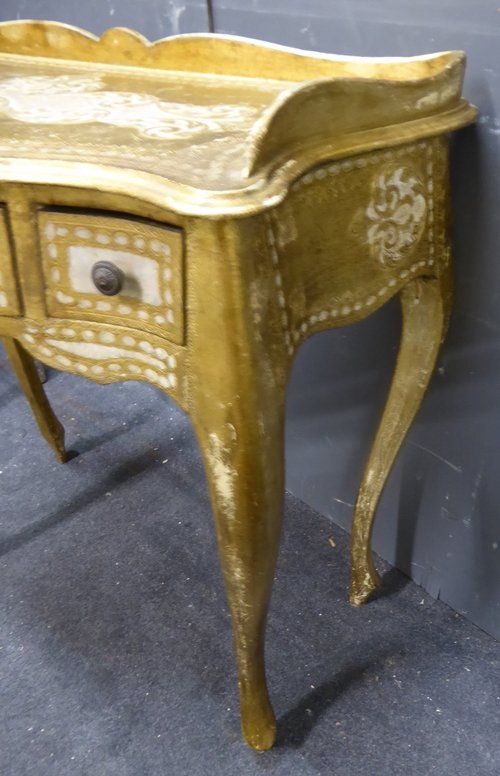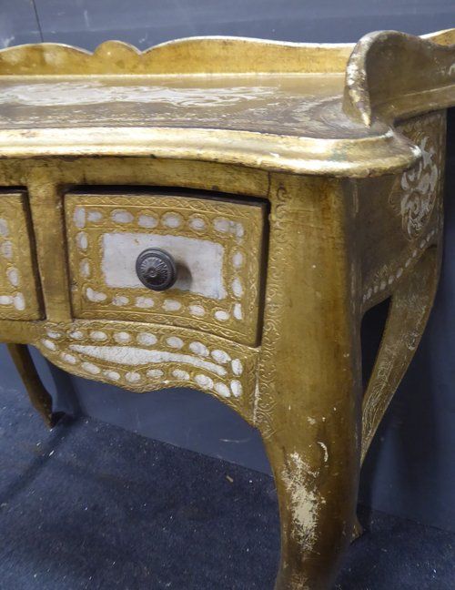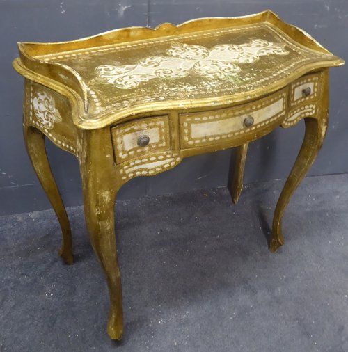 Ref 6917 - Vintage Italian three drawer desk/console table. Finished in original worn gilt and off-white. Circa 1950.