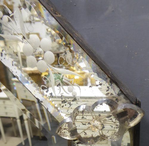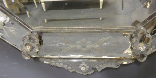Ref 6931 - Antique Venetian Mirror - 19th Century octagonal crested Venetian antique mirror with reverse etched decoration to crests and margins. Original glass with bevelled centre plate. Original pine board back. Circa 1890.