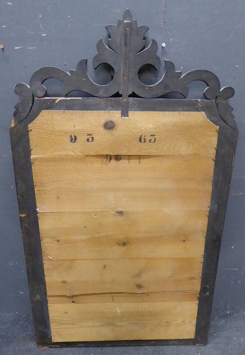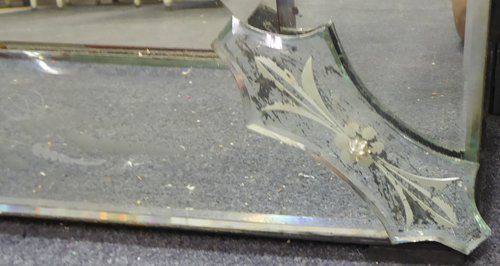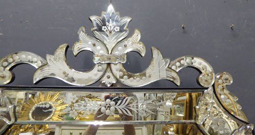 Ref 6933 - Antique Venetian Mirror - 19th Century crested Venetian antique mirror with reverse etched decoration to crest and margins. Original glass with bevelled centre plate with some faint patination patches. Original pine board back. Circa 1890.