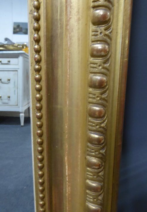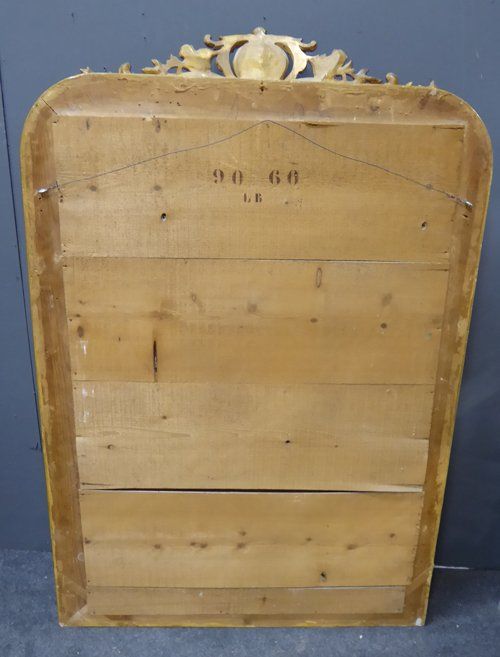 Ref 6954 - Antique French Mirror - Gilt on red Napoleon III antique mirror with gesso decoration to frame. Original glass with one small patinated area to left of plate (see close-up). Original pine board back. Circa 1870.