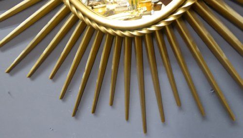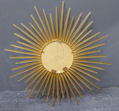 Ref 6957 - Gilt painted metal sunburst mirror stamped Chaty Vallauris. Original glass. Circa 1950.