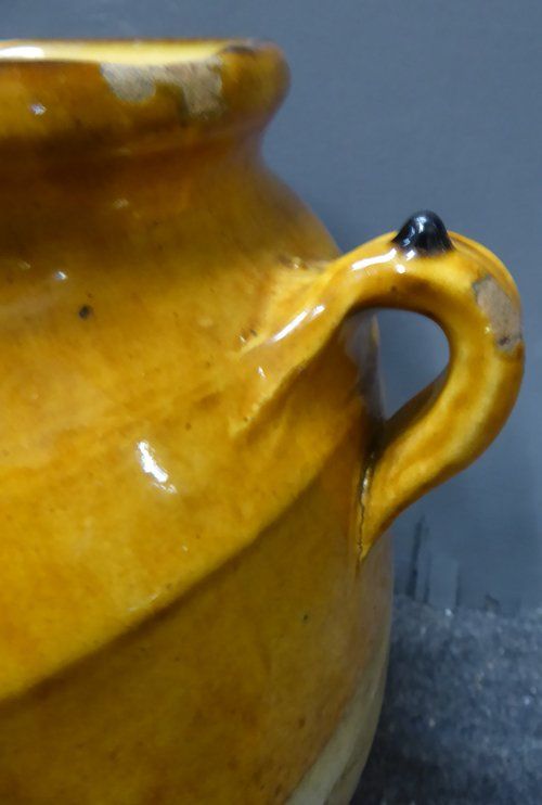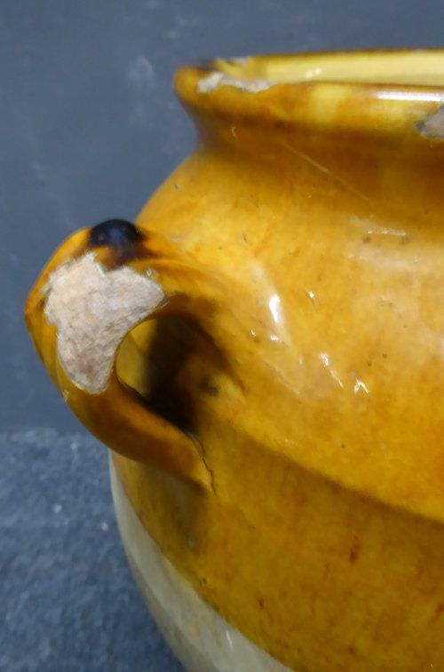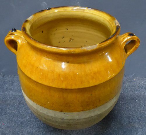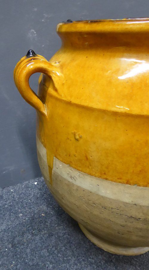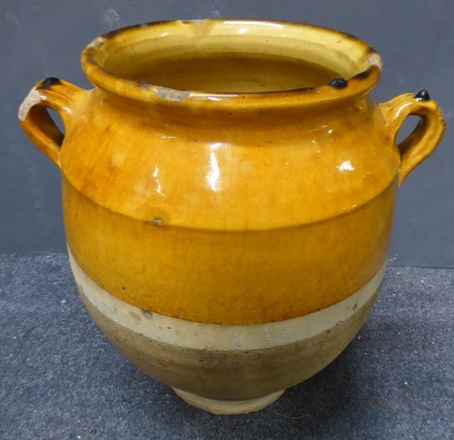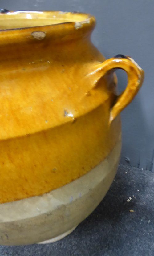 Ref 6982 - 19th Century Antique French yellow glazed terracotta confit pot with original drainage holes in bottom. These pots were mainly used in the Southern France to preserve meats like duck or goose for dishes such as cassoulet or foie gras. The lower parts were left unglazed, as the pots were half buried in the ground to keep the contents cooler and fresher. Some cracks and small chips as you would expect with an item of this age. A very decorative item which can be used for floral displays or converted for use as a lamp base.