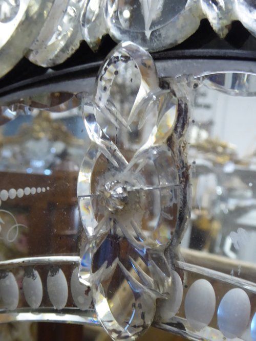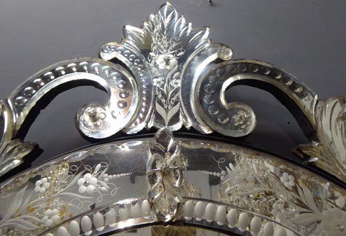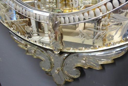 Ref 6987 - Antique Venetian Mirror - Oval crested Venetian antique mirror with reverse etched decoration. Original glass with bevelled centre plate. One cracked glass piece to top centre (see close-up). Original pine board back. Circa 1890.