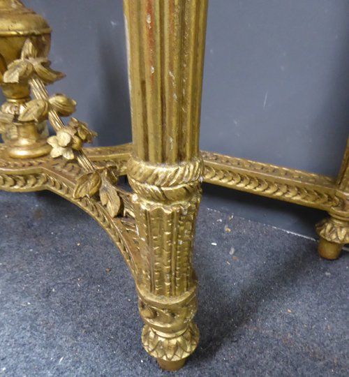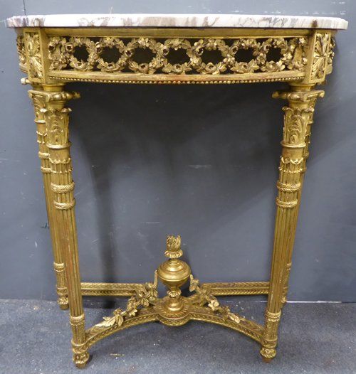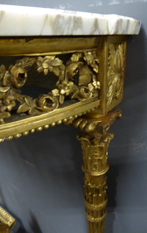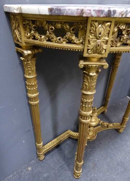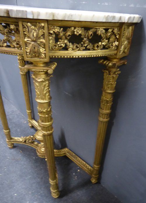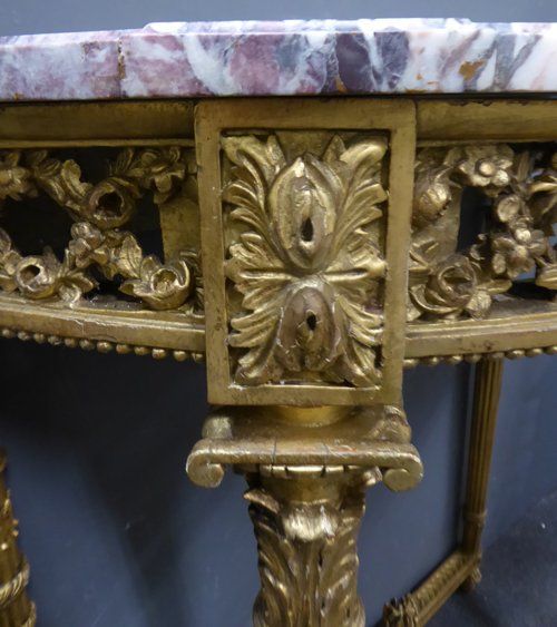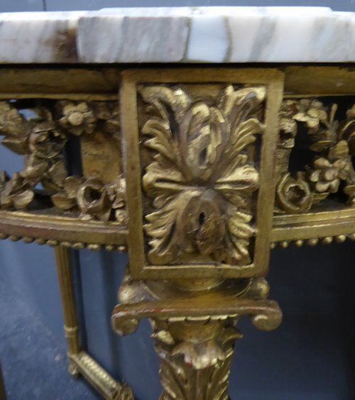 Ref 7026 - Carved giltwood Louis XVI period antique French demi-lune console table with original shaped marble top. Circa 1790.