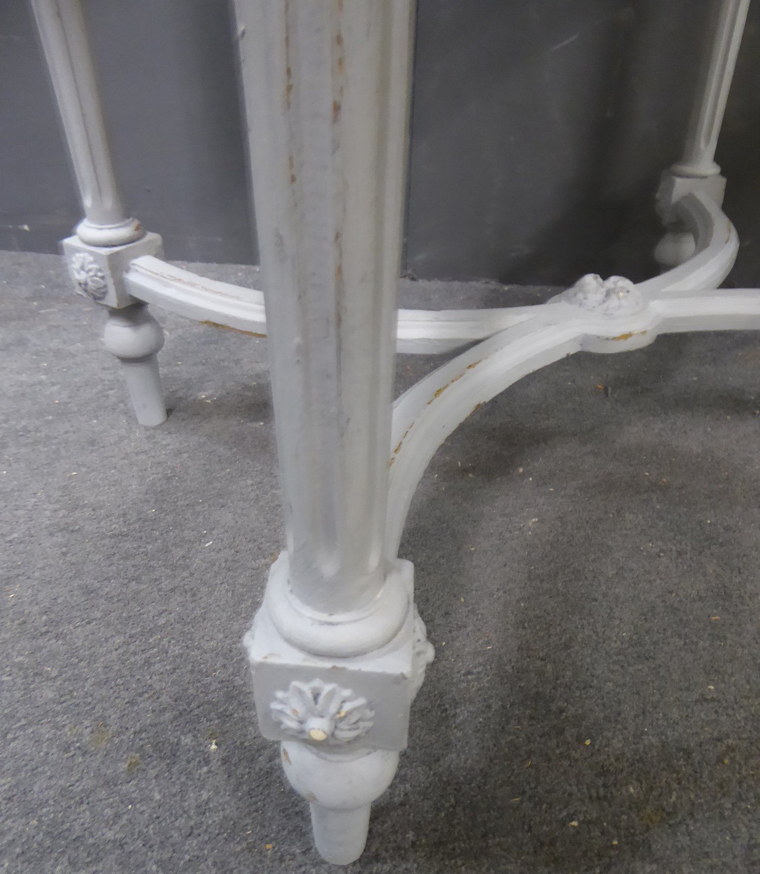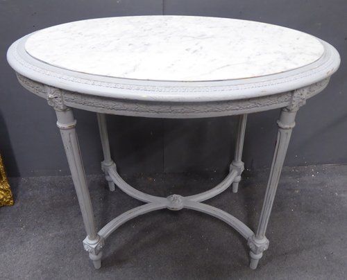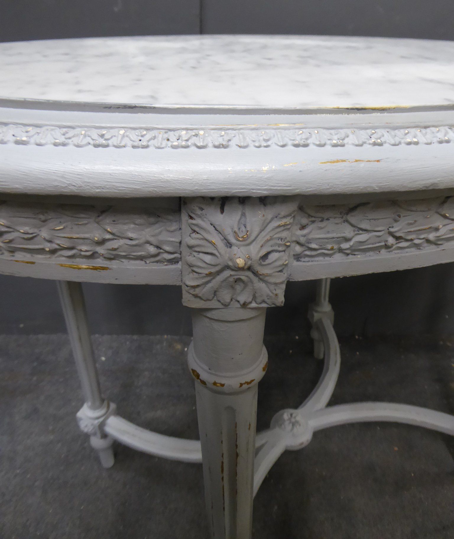 Ref 7051 - Worn grey painted antique French oval table with original marble top. Circa 1900.