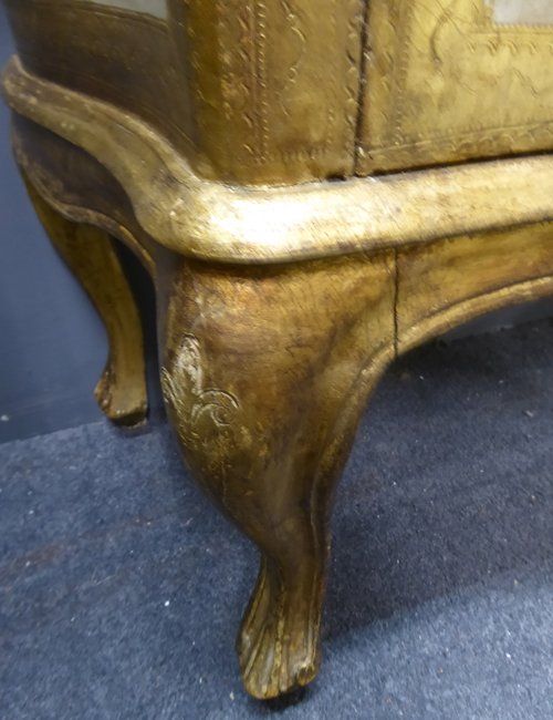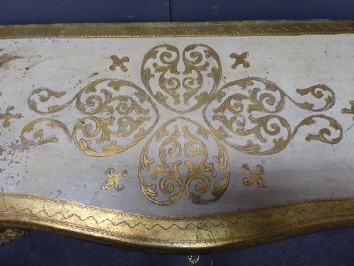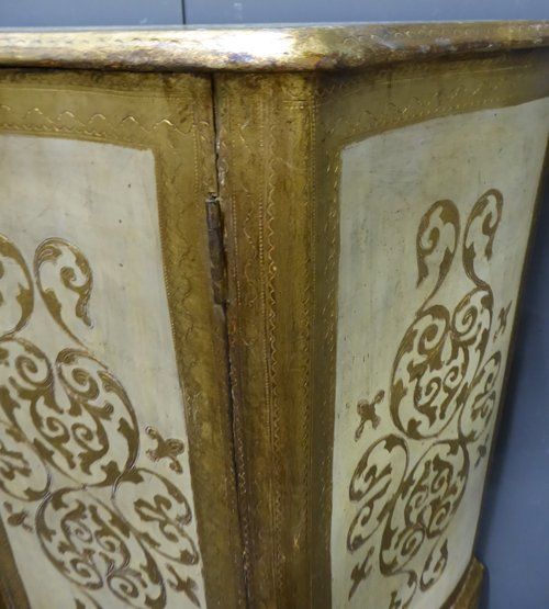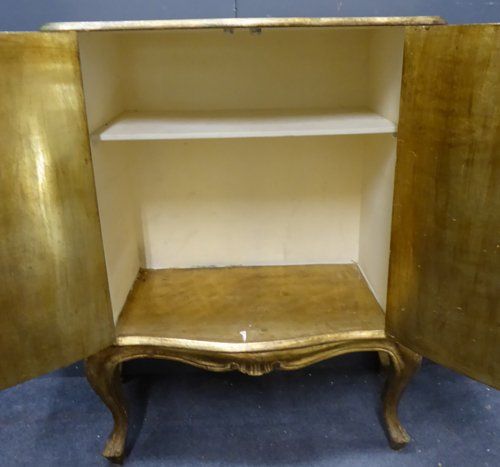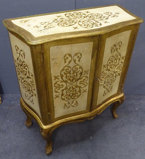 Ref 7054 - Vintage Italian two door cabinet finished in original off-white paint with gilt embossed decoration. Single shelf. Circa 1950.