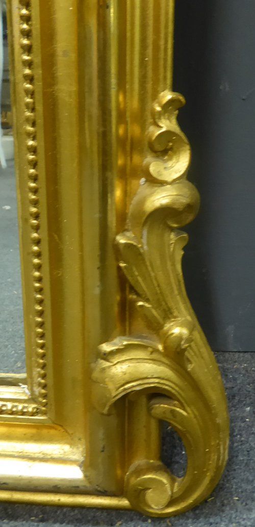 Ref 7073 - Antique French Mirror - Gilt on red Louis XV style camel crested antique mirror. Original bevelled glass with some small black patination spots. Original pine board back. Circa 1890.