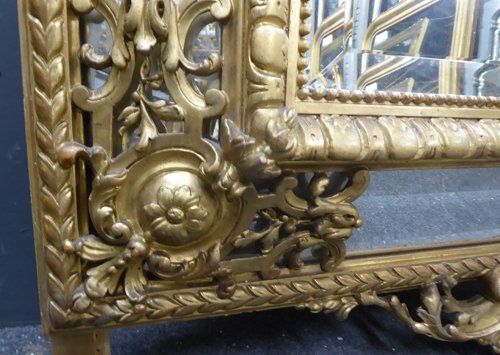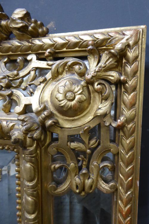 Ref 7088 - Antique French Mirror - Gilt on red Napoleon III antique crested cushion margin mirror. Original bevelled glass. Original pine board back. Circa 1870.