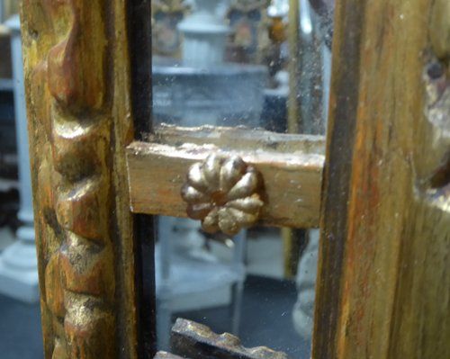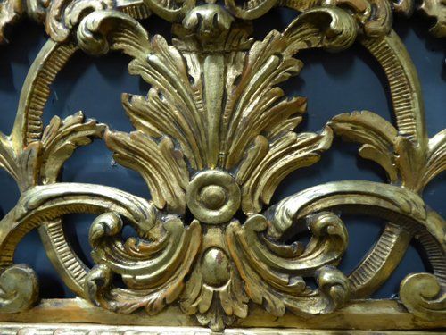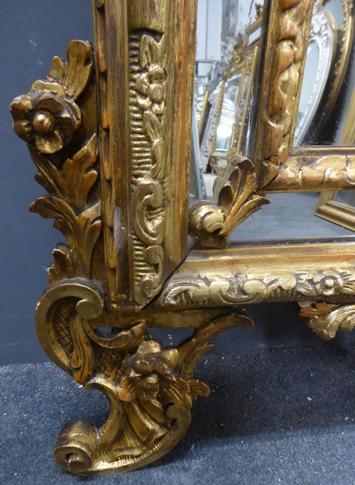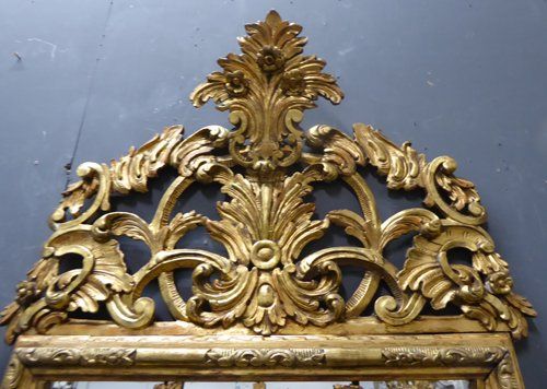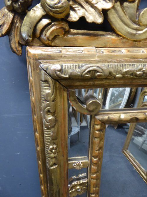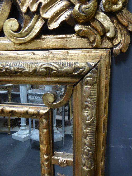 Ref 7090 - Antique French Mirror - Large period early 18th Century carved giltwood Louis XIV antique double crested mirror. Some old restoration and possible later decorative additions over glass margins (see close-up). Original mercury glass. Original wooden back with some old, inactive and treated woodworm holes. Circa 1715.
