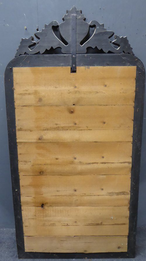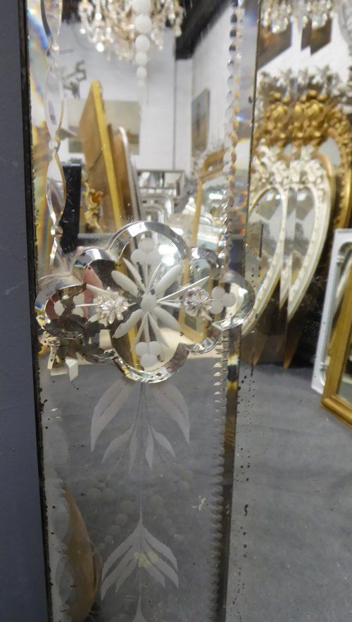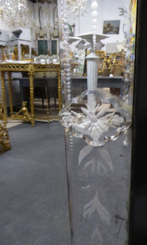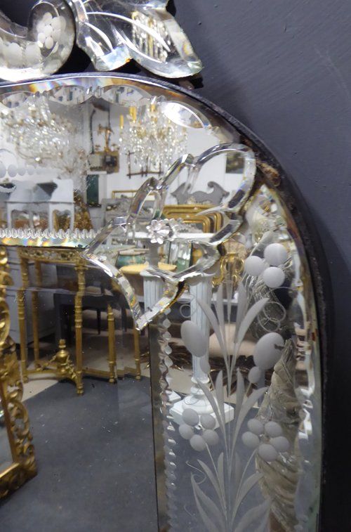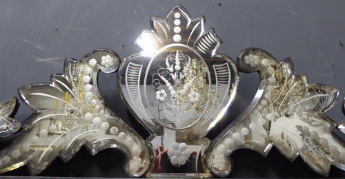 Ref 7097 - Antique Venetian Mirror - Large 19th Century crested Venetian Louis Philippe antique mirror with reverse etched decoration to crests and margins. Original glass with bevelled centre plate. One small repair to outer edge of right hand top margin glass and one cracked piece to bottom left corner (see close-ups). Original pine board back. Circa 1890.