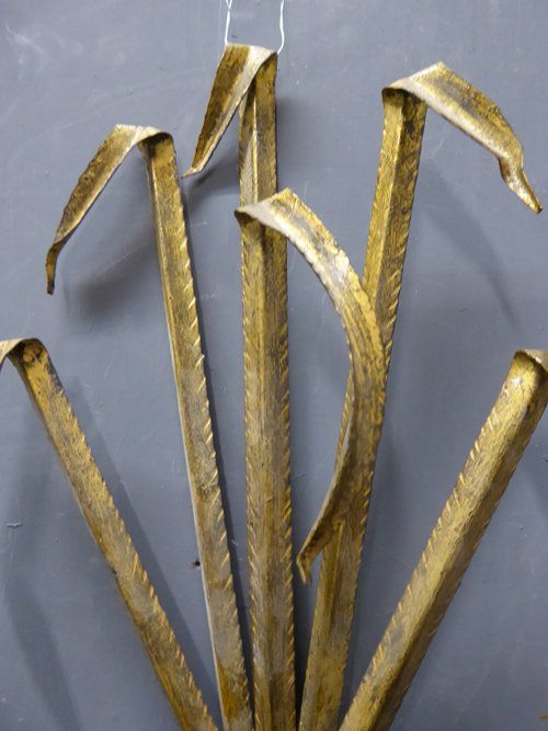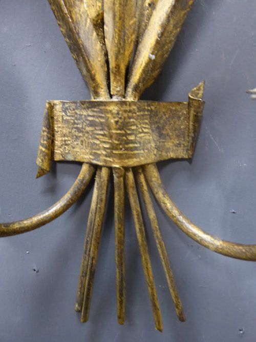 Ref 7159 - Pair of vintage Italian gilt painted metal two arm rush leaf decorated wall lights. Old wiring (needs checking). Circa 1950.