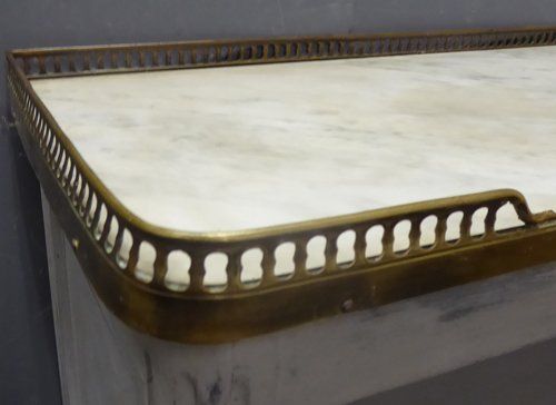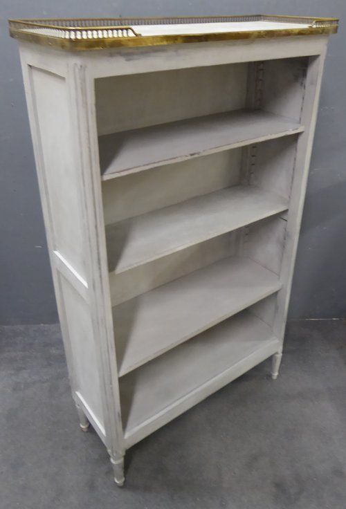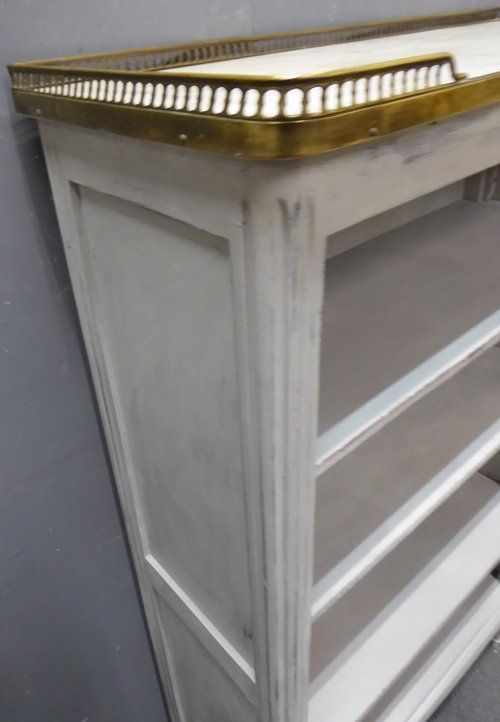 Ref 7162 - Worn grey painted French bookcase with one fixed central shelf and two adjustable shelves. Original brass gallery and marble top. Circa 1950.