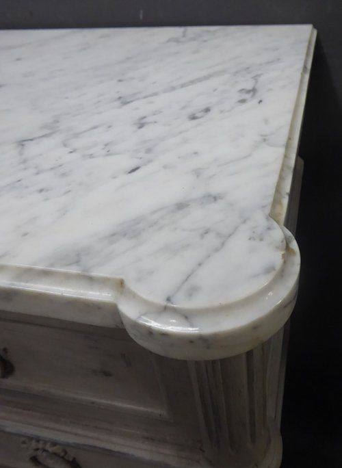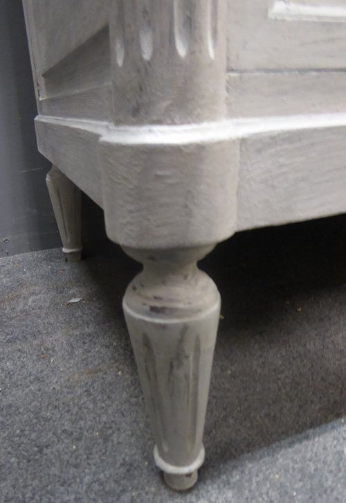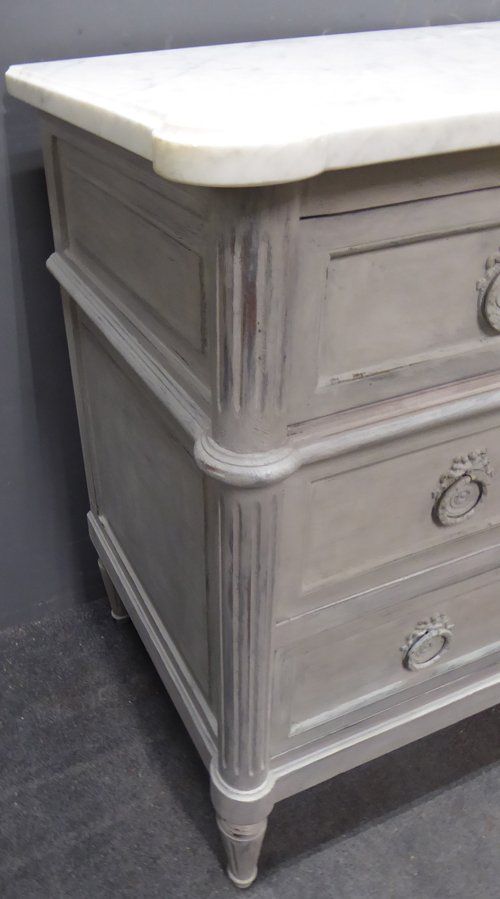 Ref 7164 - Antique French worn grey painted Louis XVI style commode chest of drawers. Five drawers, original lock and key to top centre drawer. Original shaped marble top. Original fittings. Circa 1900.