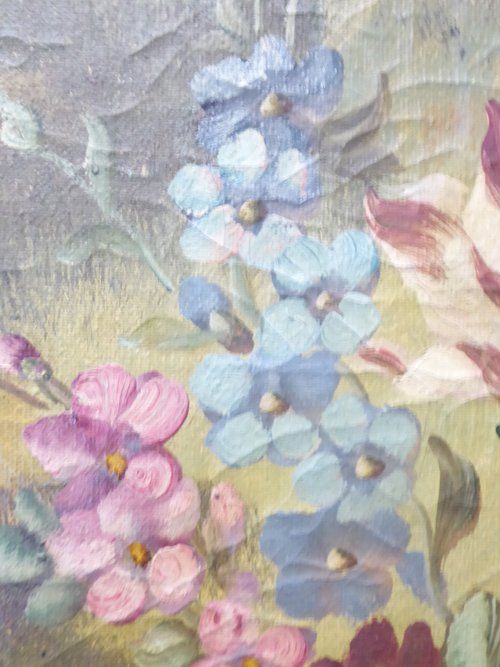 Ref 7168 - French oil on canvas still life of flowers. Original wooden mount. Signed. Circa 1950.