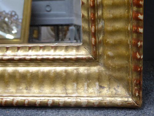 Ref 7169 - Antique French Mirror - Gilt on red ripple decorated landscape/portrait French antique mirror. New glass. Later replaced back. Circa 1830.