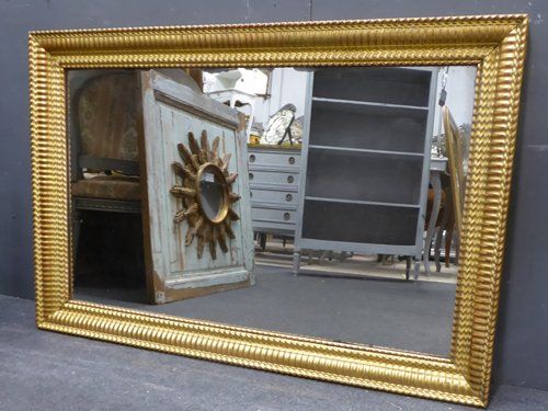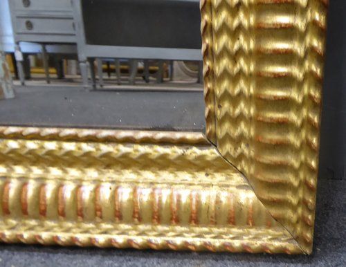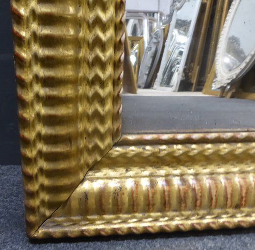 Ref 7177 - Antique French Mirror - Gilt period ripple decorated antique mirror worn through to red bole in places. Landscape/portrait. Original mercury glass with some patinated areas. Original pine board back. Circa 1830.