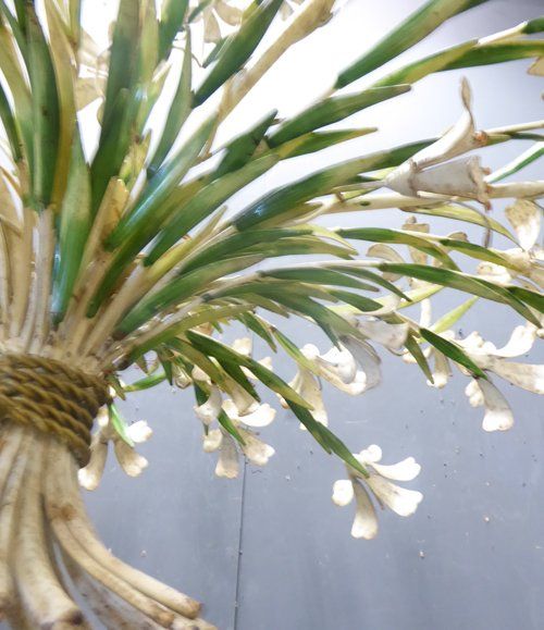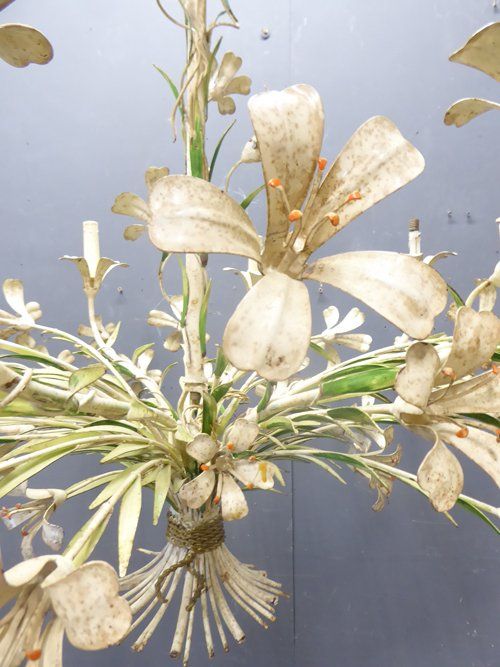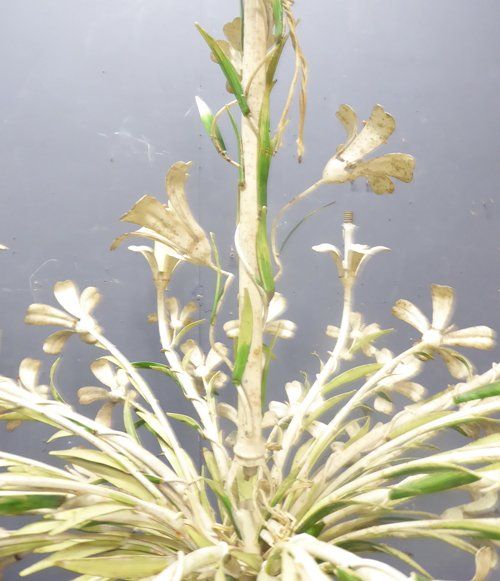 Ref 7183 - Large 8 arm painted metal flower vintage French chandelier. Finished in original off-white and green paint. Original ceiling rose. Old wiring (needs checking). Circa 1950.