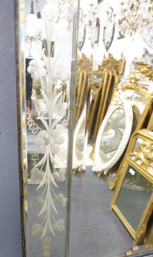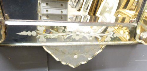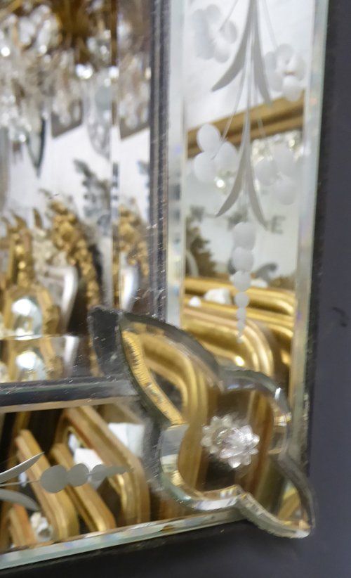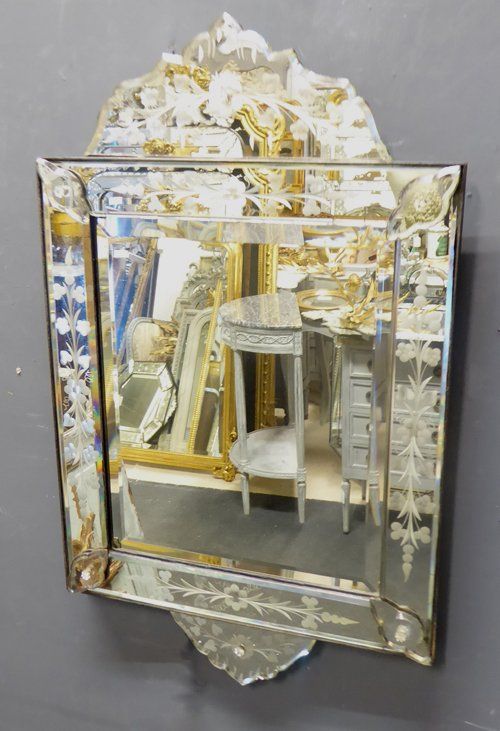 Near Pair of Antique Venetian Mirrors - Near pair of crested 19th Century Venetian antique mirrors with reverse etched decoration to outer margins. Original glass with bevelled centre plate. Circa 1890.