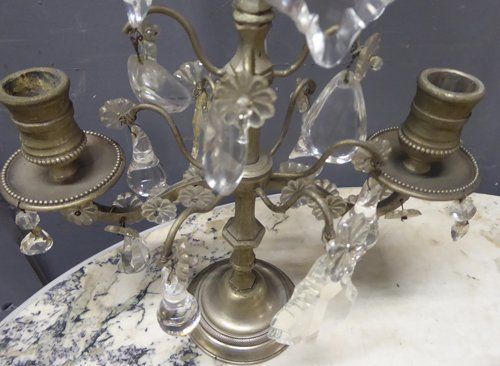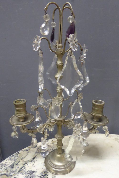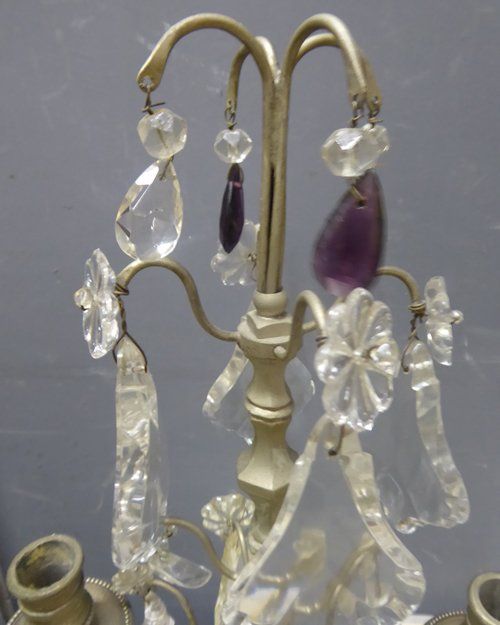 Ref 7235 - Pair of French silver coloured metal two arm table lights with original clear and amethyst crystals. Circa 1930.