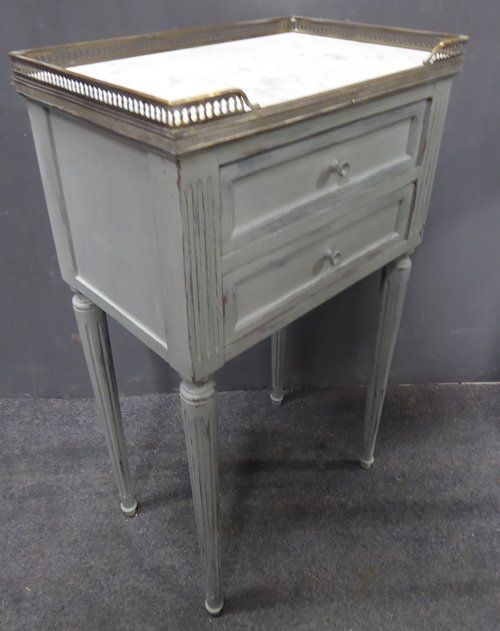 Ref 7245 - Pair of worn grey painted Louis XVI style French two drawer bedside cabinets with original marble tops and fretted brass gallery. Circa 1950.