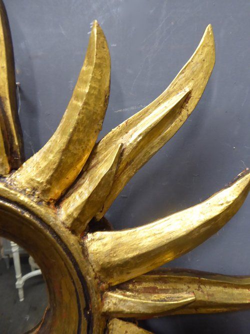 Ref 7264 - Carved giltwood sunburst mirror with original patinated glass. Circa 1950.