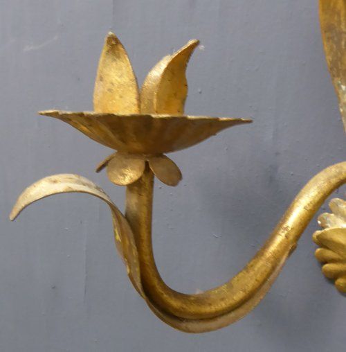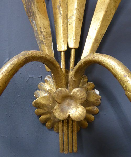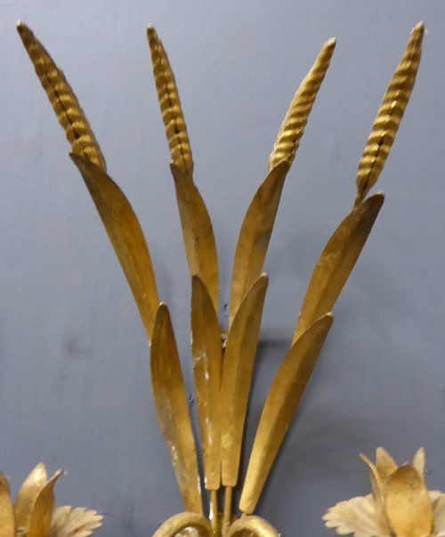 Ref 7265 - Pair of French gilt painted tole wheatsheaf wall lights for candles. Circa 1950.