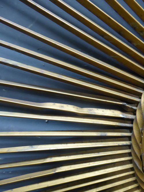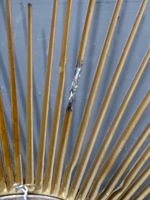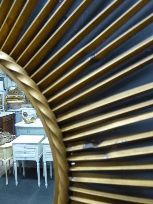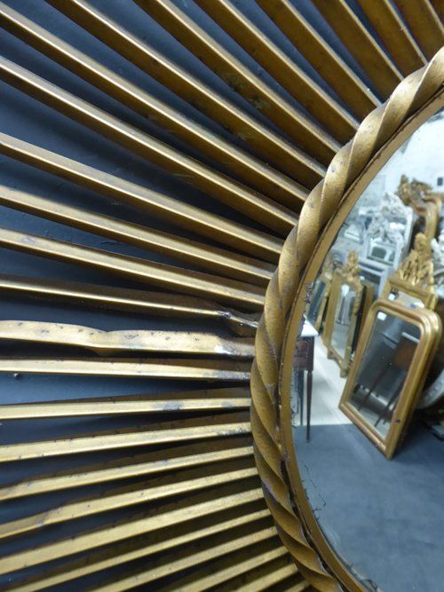 Ref 7275 - Large distressed French Chaty Vallauris stamped gilt metal sunburst mirror with some bent and twisted arms. Original glass and back. Circa 1950.