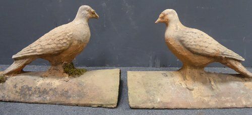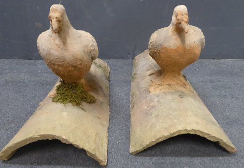 Ref 7291 - Pair of old Mediterranean terracotta ridge tiles decorated with a long tailed dove.