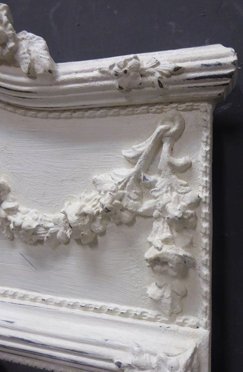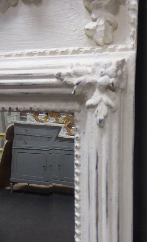 Ref 7302- Antique French Mirror -Ribbon crested worn white painted antique trumeau mirror with gesso decoration to frame. Original bevelled glass with some small patinated areas. Original thin veneer back. Circa 1900.