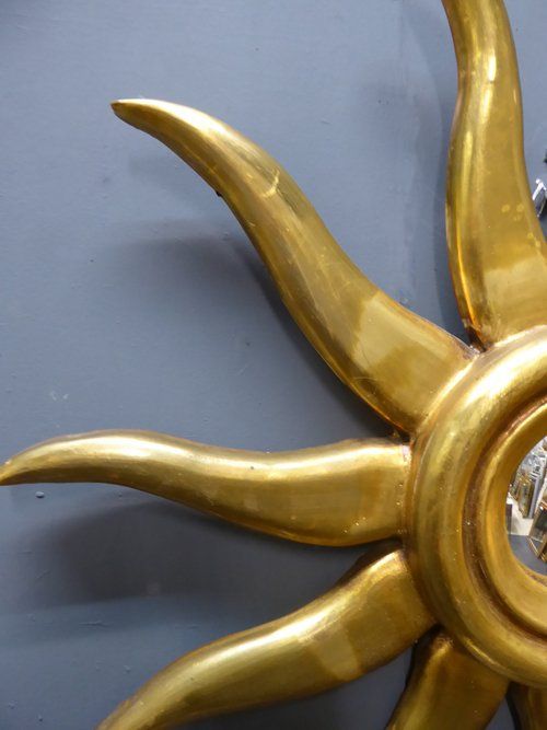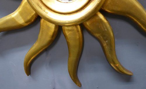 Ref 7312 - French carved giltwood sunburst mirror with original convex glass. Circa 1950.