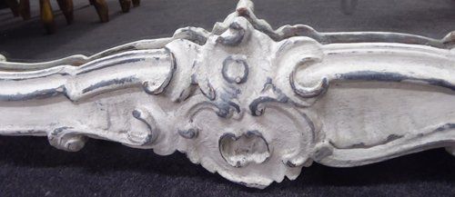 Ref 7318 - Antique French Mirror - Landscape Louis XV style carved wood antique French mirror finished in worn white over dark grey paint. Original glass. Original thin cardboard back. Circa 1880.
