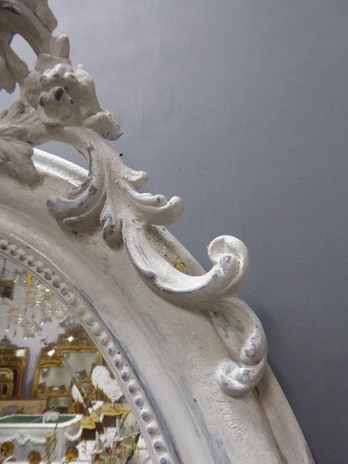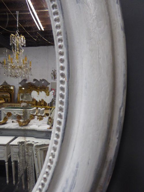 Ref 7321 - Antique French Mirror - Period worn grey painted Louis Philippe crested oval antique mirror. Original bevelled mercury glass. Original pine board back. Circa 1840.